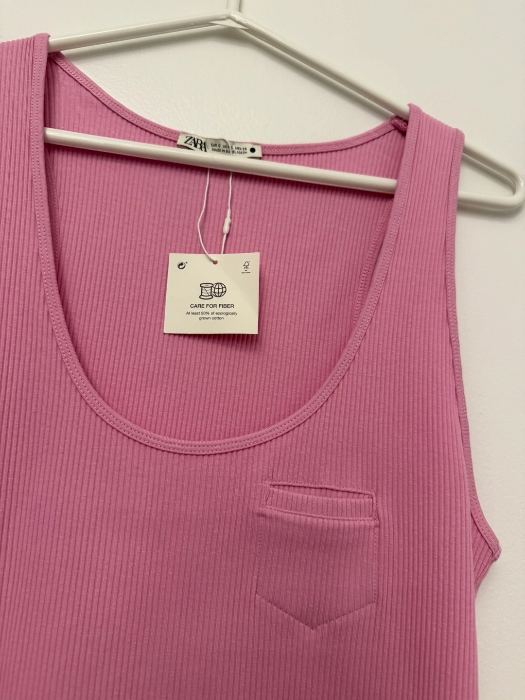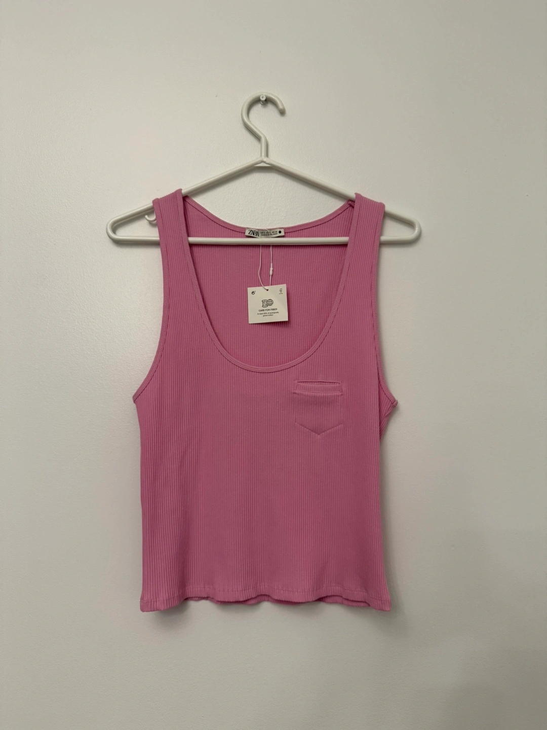 Selling a cute Zara pink ribbed tank top in size S. It's in great condition and features a small pocket detail. New with tags!