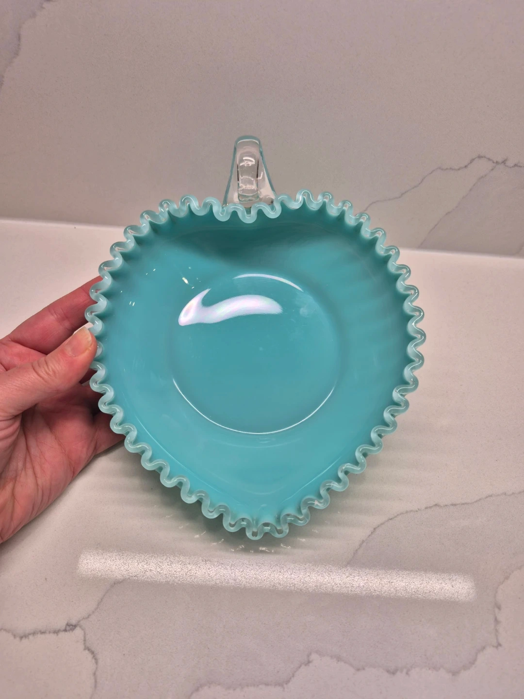 This is a beautiful vintage turquoise milk glass dish shaped like a heart. It features a delicate ruffled edge and a clear glass handle. This piece would make a lovely decorative item for any room.