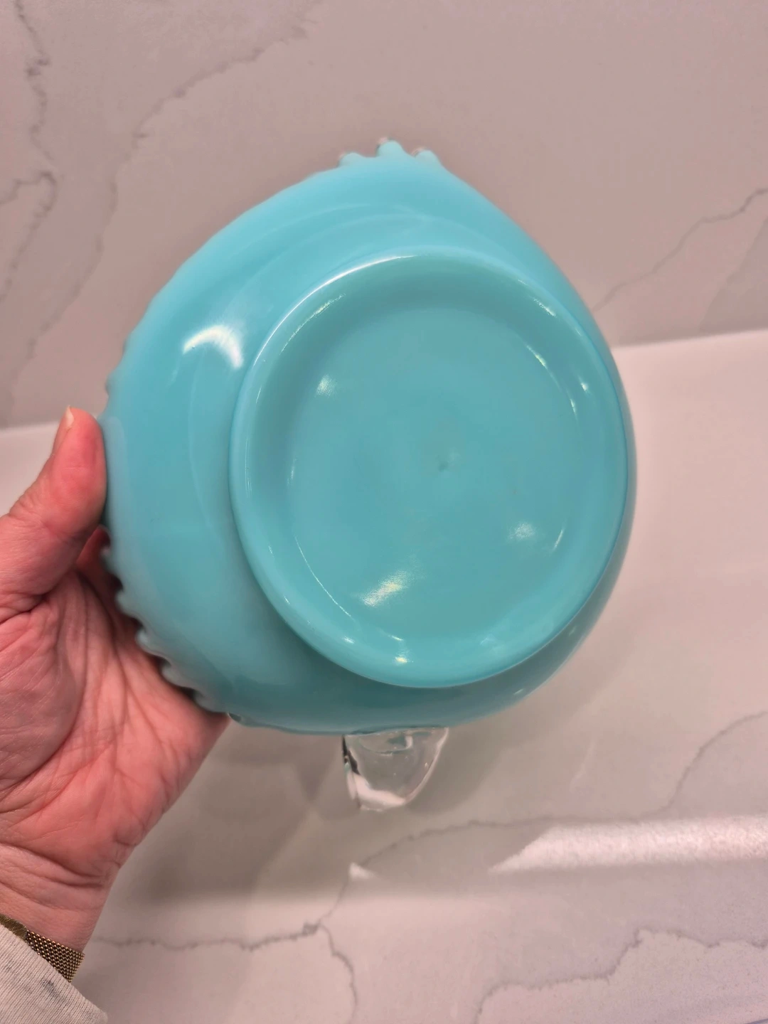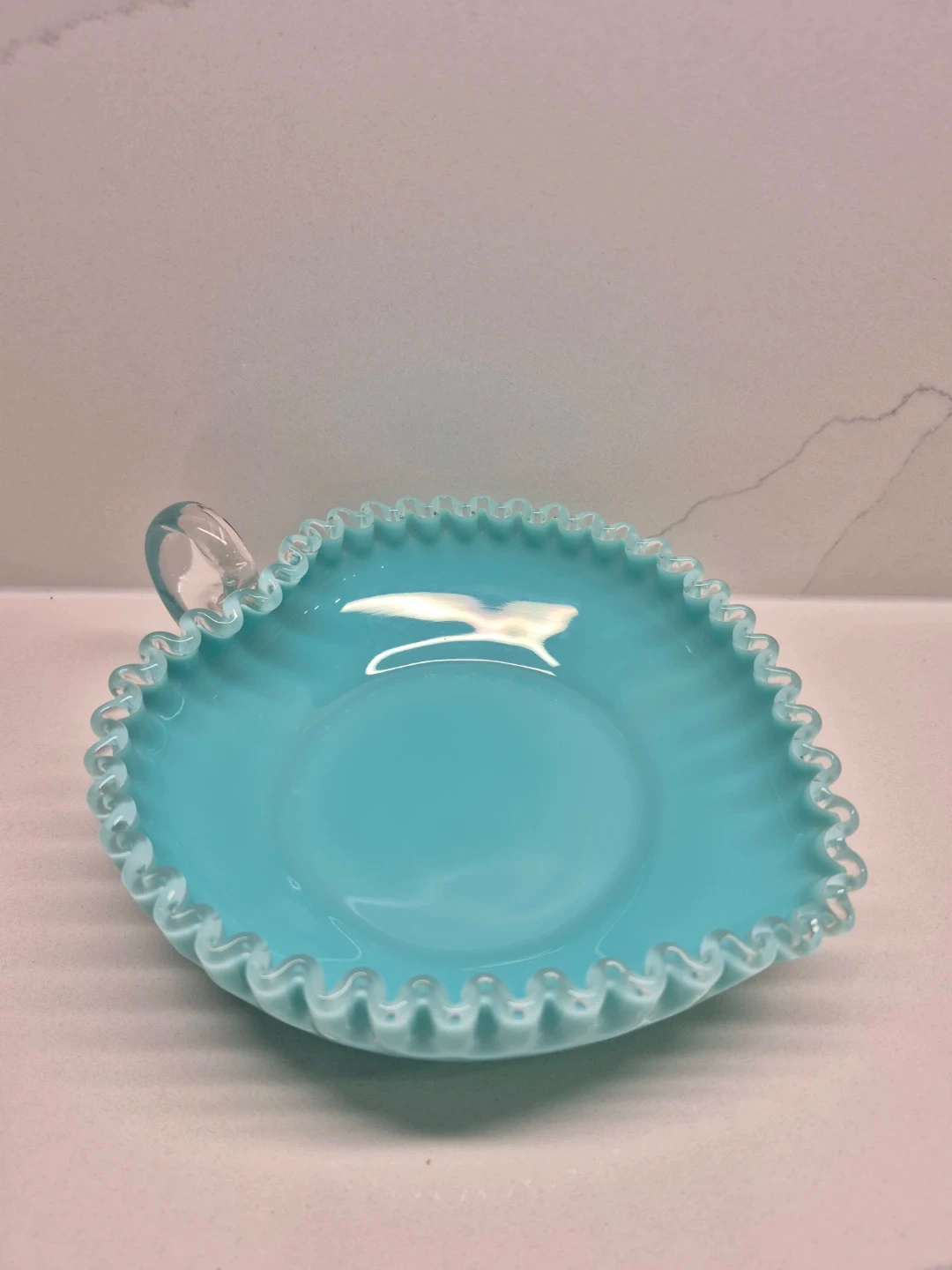 This is a beautiful vintage turquoise milk glass dish shaped like a heart. It features a delicate ruffled edge and a clear glass handle. This piece would make a lovely decorative item for any room.