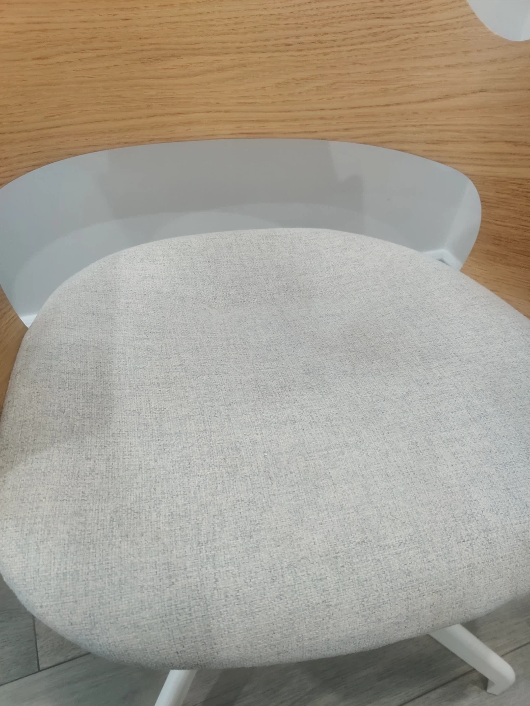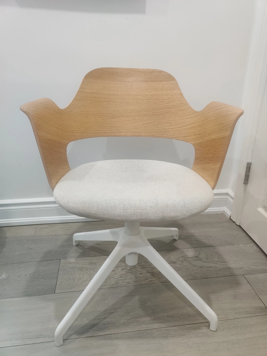 Office chair with a natural wood-look back and a light grey fabric seat.