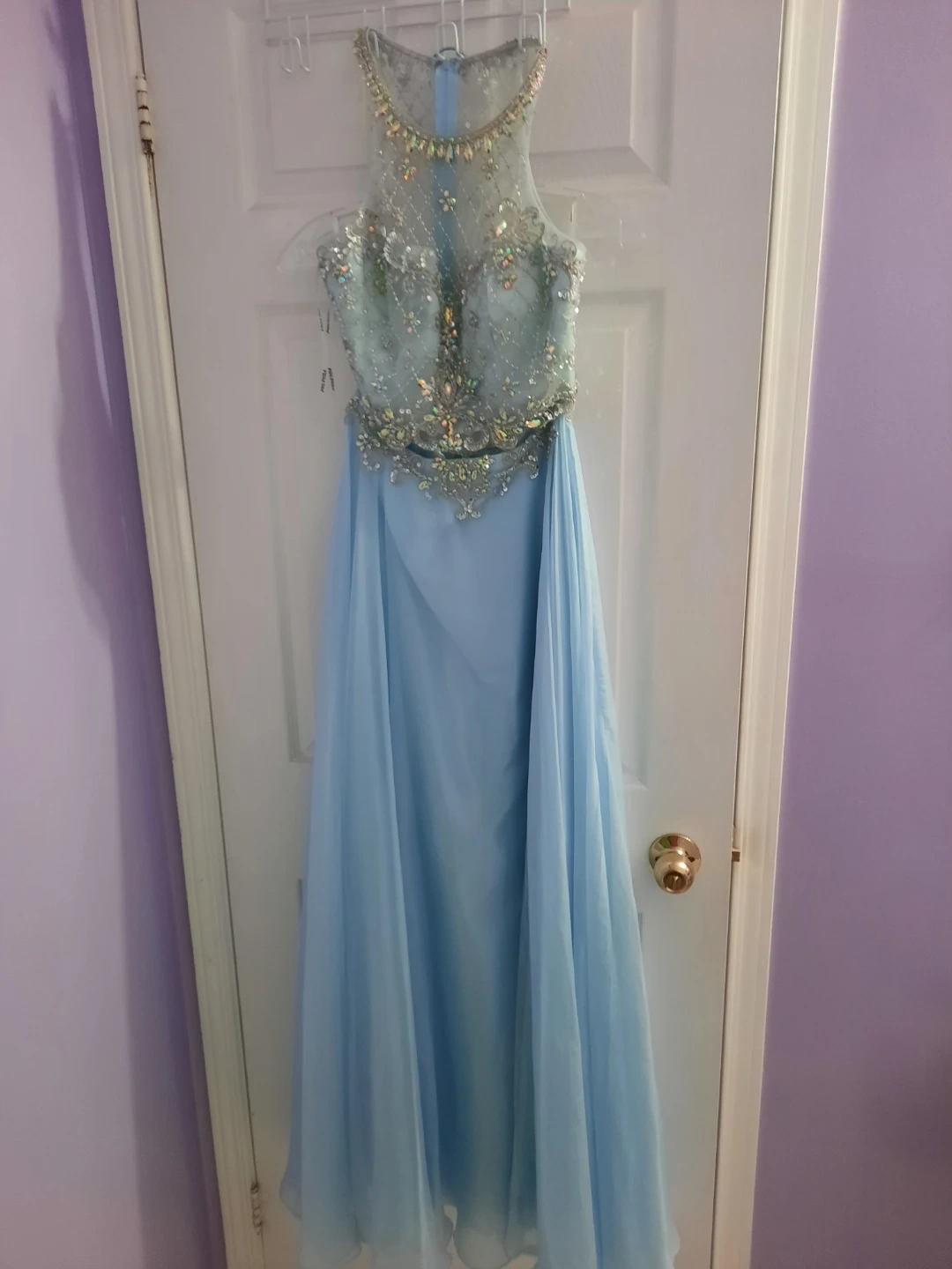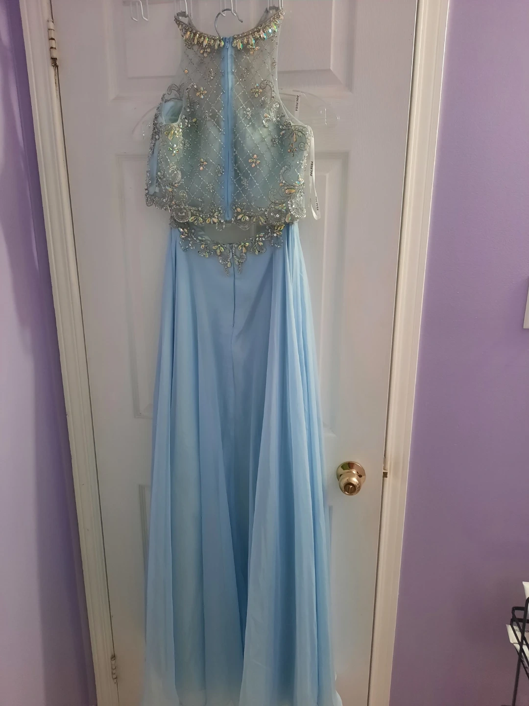 Gorgeous light blue beaded two-piece prom dress with a halter neckline. It's heavily embellished on the bodice and skirt waist. Sheer overlay with intricate beadwork. Brand new. Never been worn.