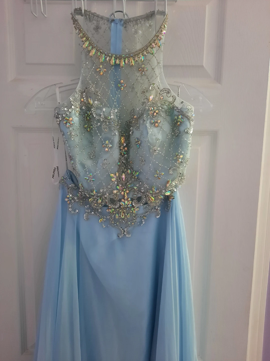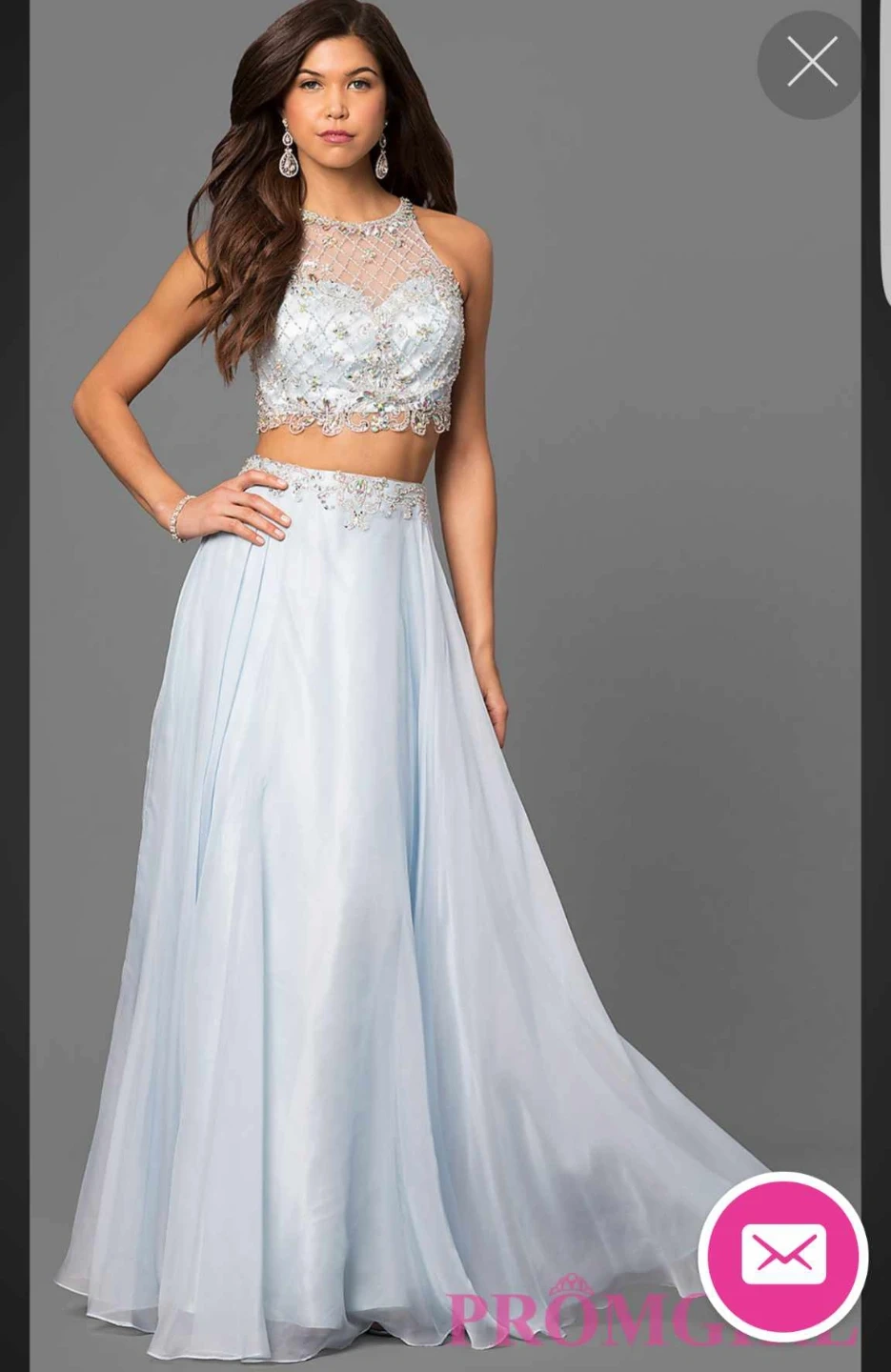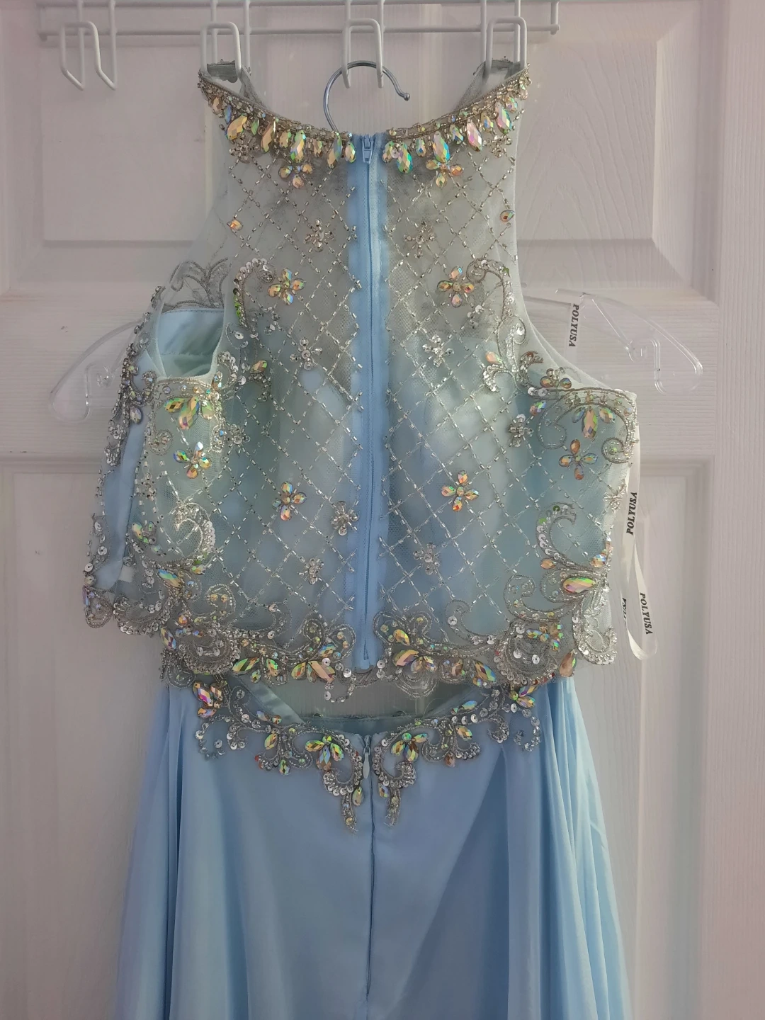Gorgeous light blue beaded two-piece prom dress with a halter neckline. It's heavily embellished on the bodice and skirt waist. Sheer overlay with intricate beadwork. Brand new. Never been worn.