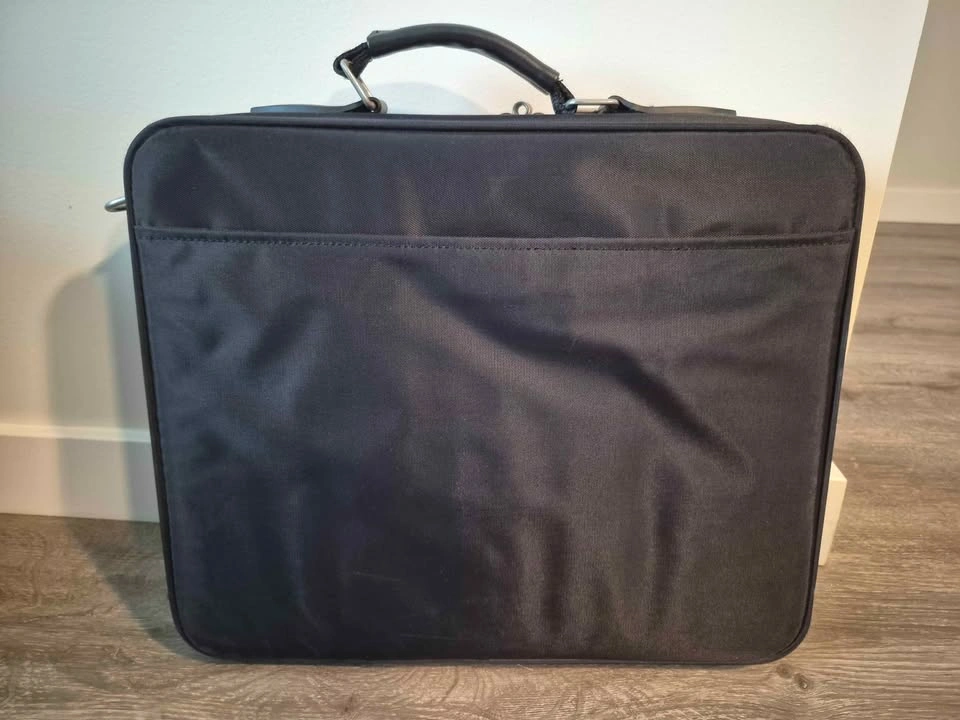 Black durable material, a front flap with a distinctive red circular logo featuring a white cross, and professional styling.