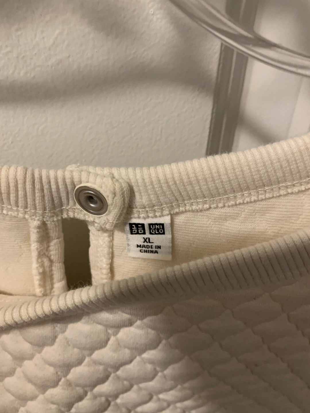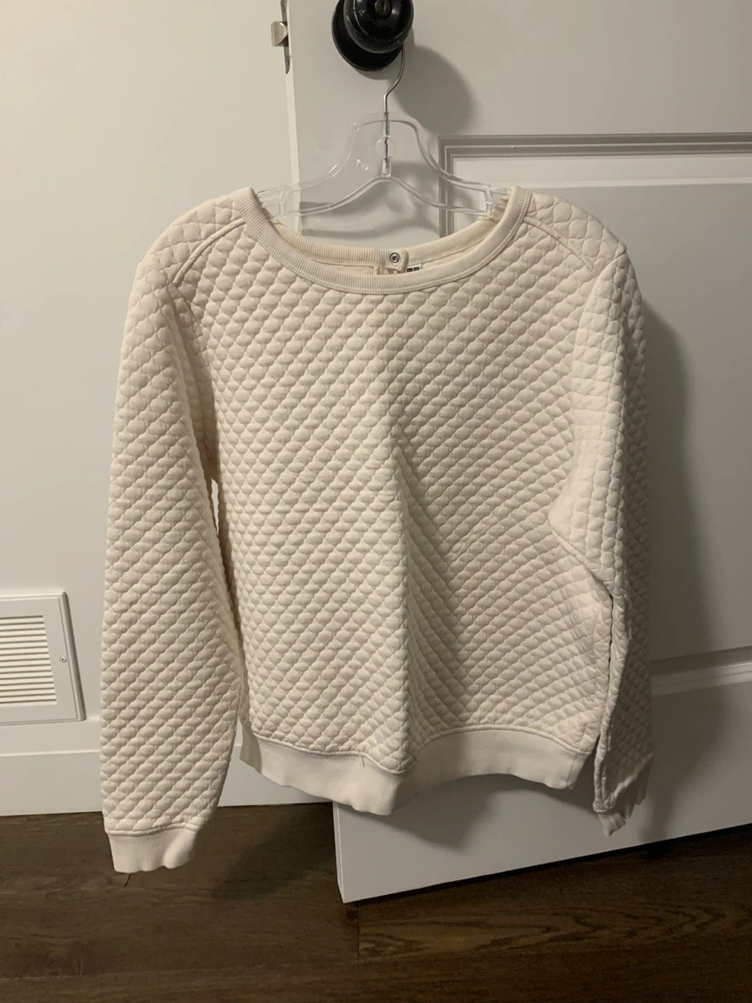 This is a Uniqlo quilted crewneck sweater. It's size XL and off-white in colour. The sweater is made of a soft, textured material.