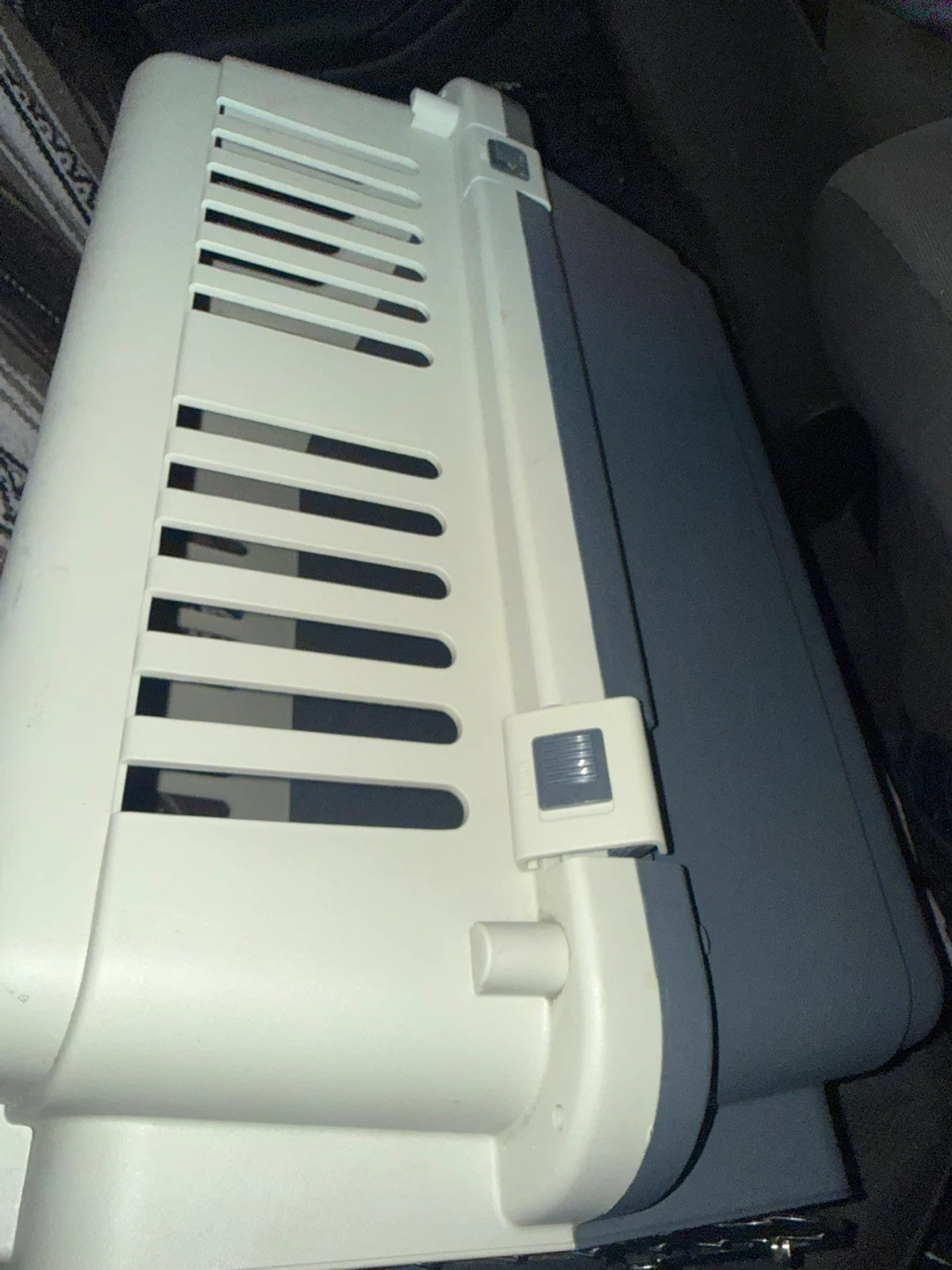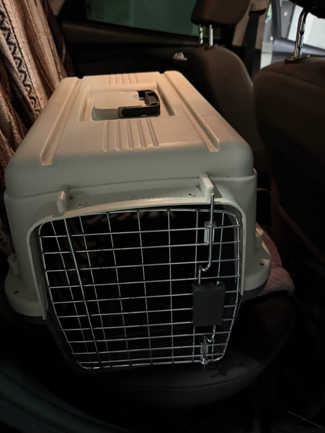 This is a pet carrier. It's made of plastic and has a metal door. It's great for transporting small pets. It's easy to clean too!