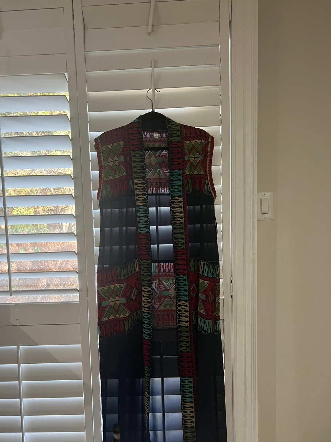 Selling a unique patterned vest. It has a black base with red, green, and beige designs. It's in great condition and would be a stylish addition to any wardrobe