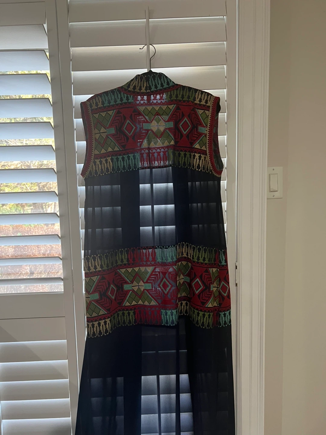 Selling a unique patterned vest. It has a black base with red, green, and beige designs. It's in great condition and would be a stylish addition to any wardrobe