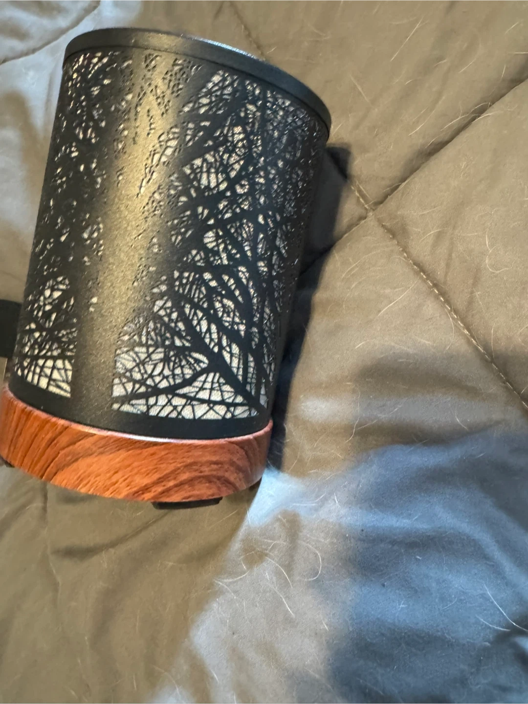 This aroma diffuser features a black metal shade with an intricate tree silhouette design. It has a faux wood base and a power cord is included. It's perfect for adding a cozy ambiance and pleasant scents to any room.