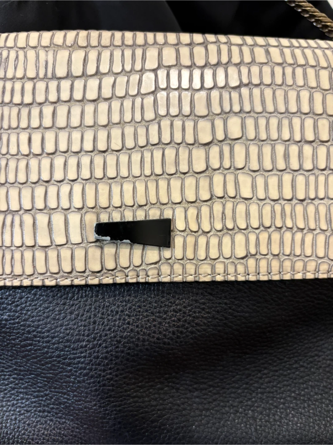 This chic clutch features a black pebbled leather body with an embossed flap in a cream tone. It includes a delicate gold-tone chain strap for versatile wear. Inside, you'll find multiple zippered compartments and slip pockets for organization.