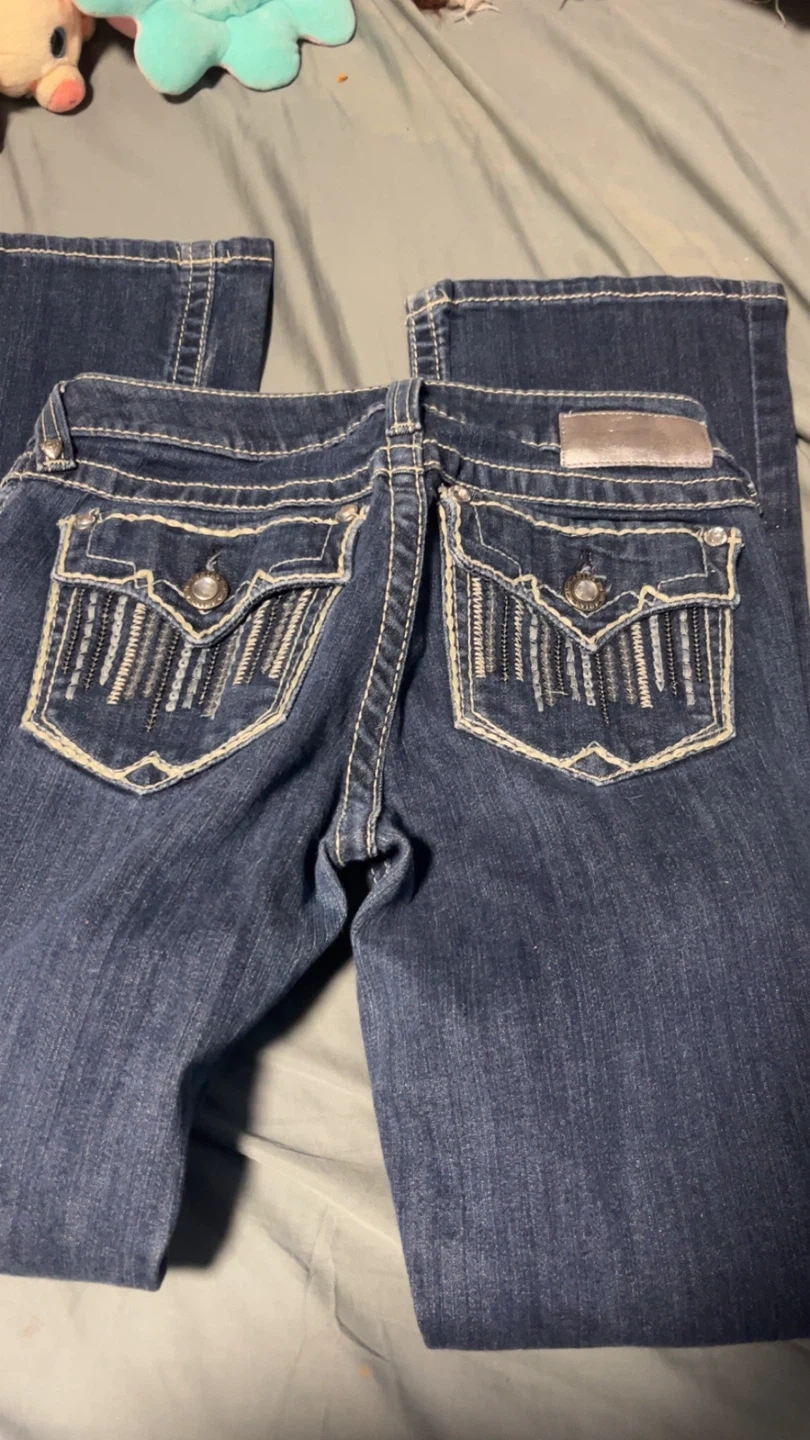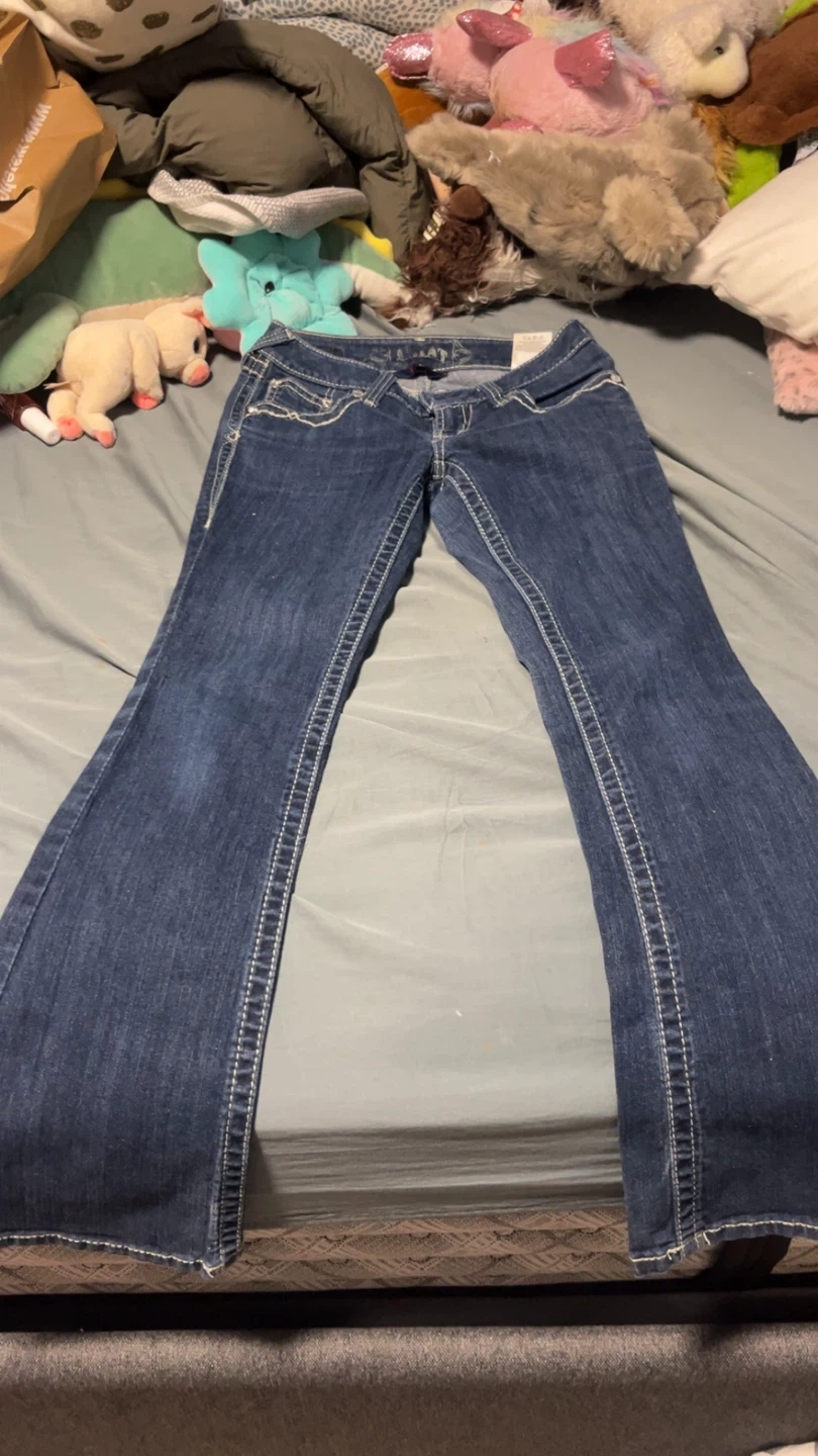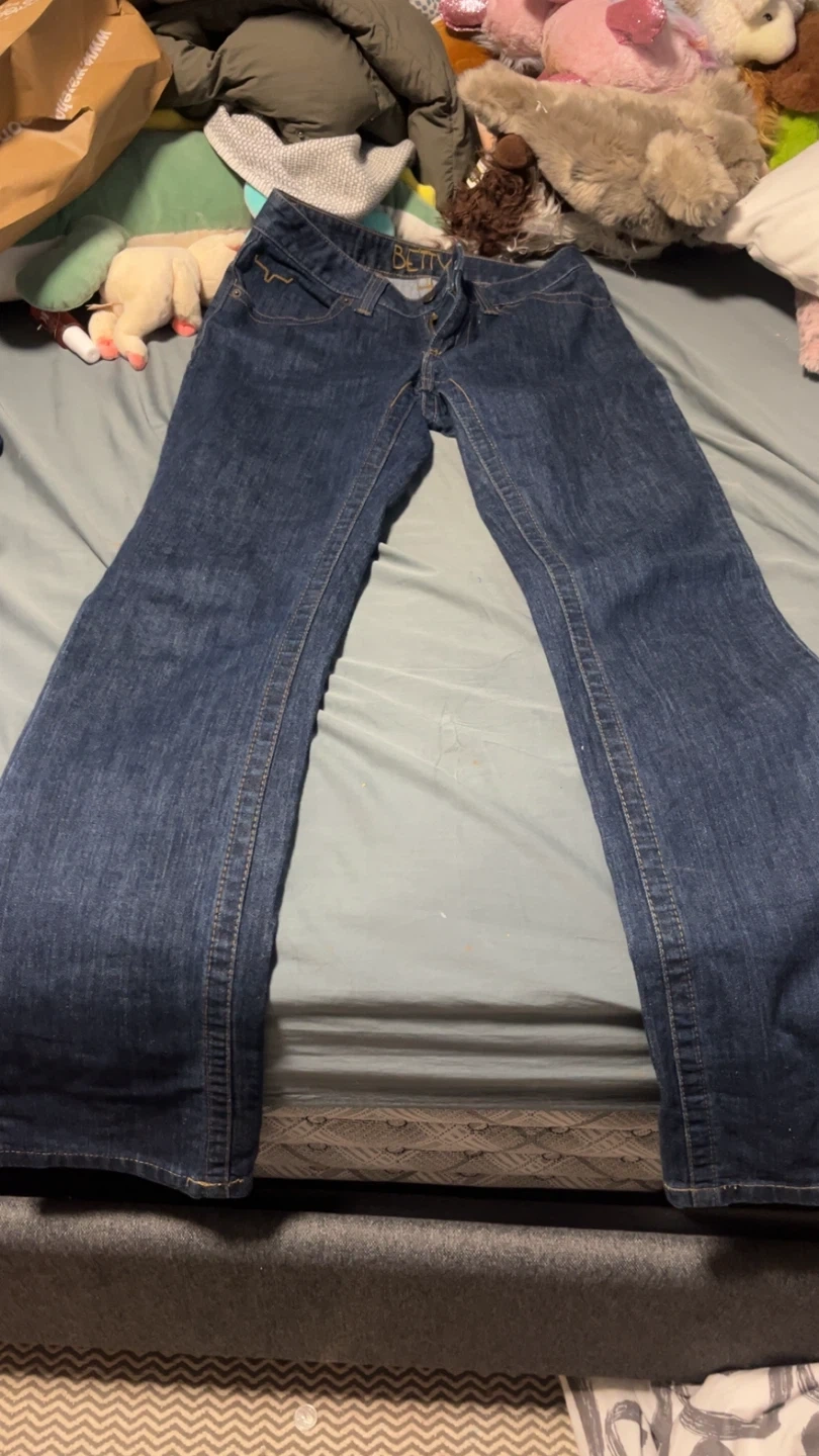 Dark wash bootcut Kimes Betty jeans. These jeans are a size 6 with a 34 inch inseam. They feature a classic western-style back pocket design with orange stitching. Perfect for everyday wear! Y2K style western style featuring brands like kimes and ariat prices on image