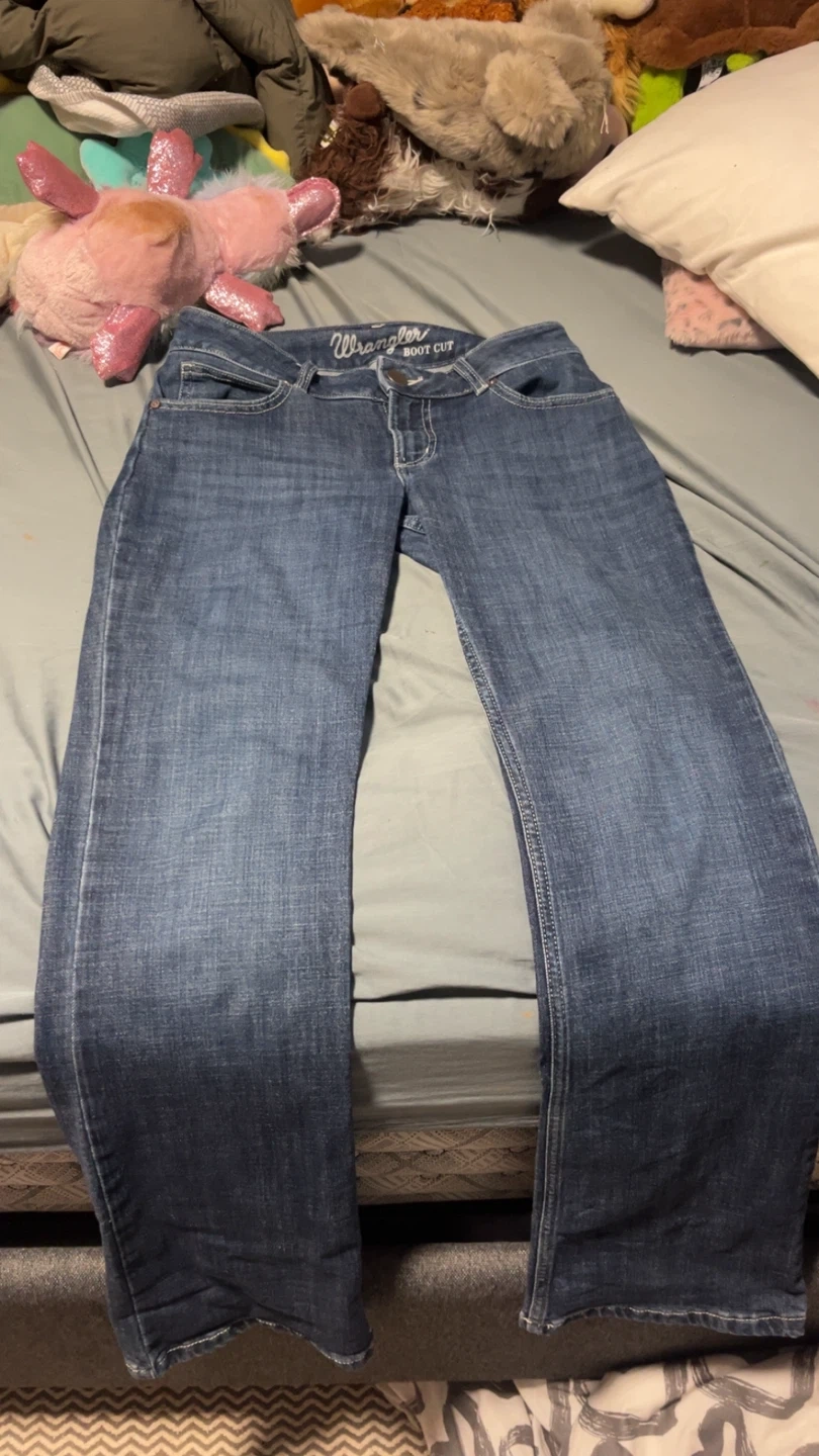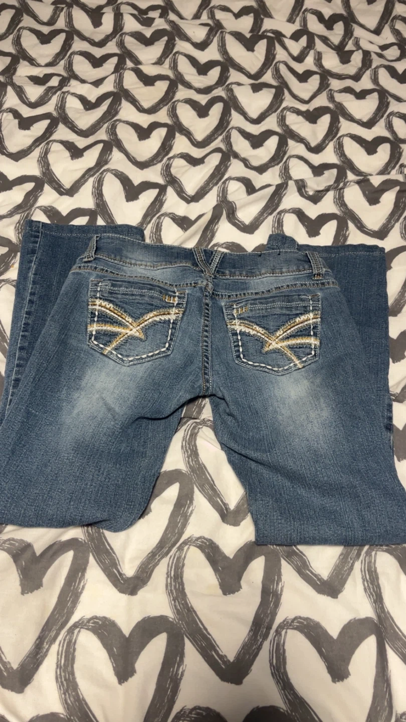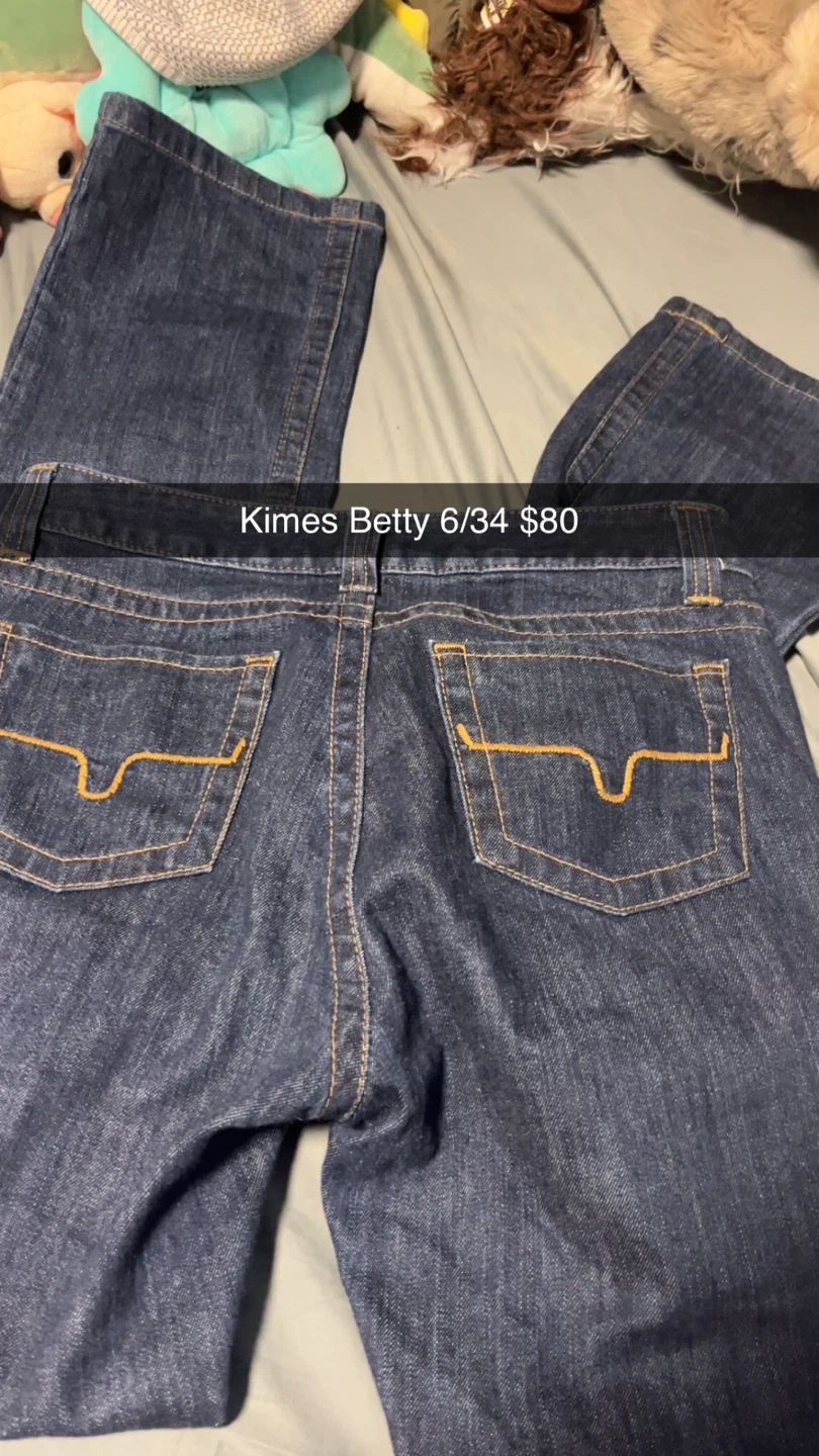 Dark wash bootcut Kimes Betty jeans. These jeans are a size 6 with a 34 inch inseam. They feature a classic western-style back pocket design with orange stitching. Perfect for everyday wear! Y2K style western style featuring brands like kimes and ariat prices on image