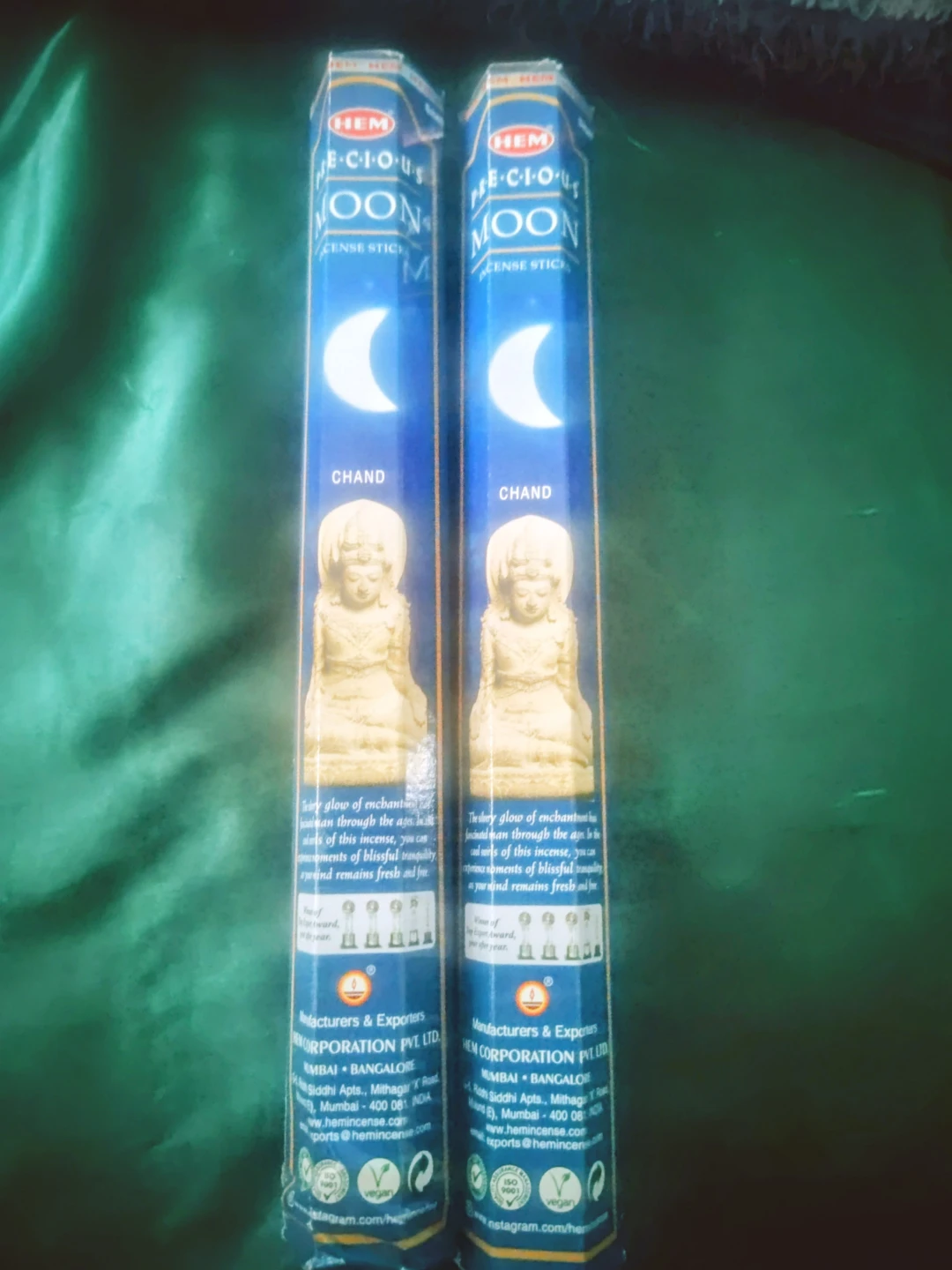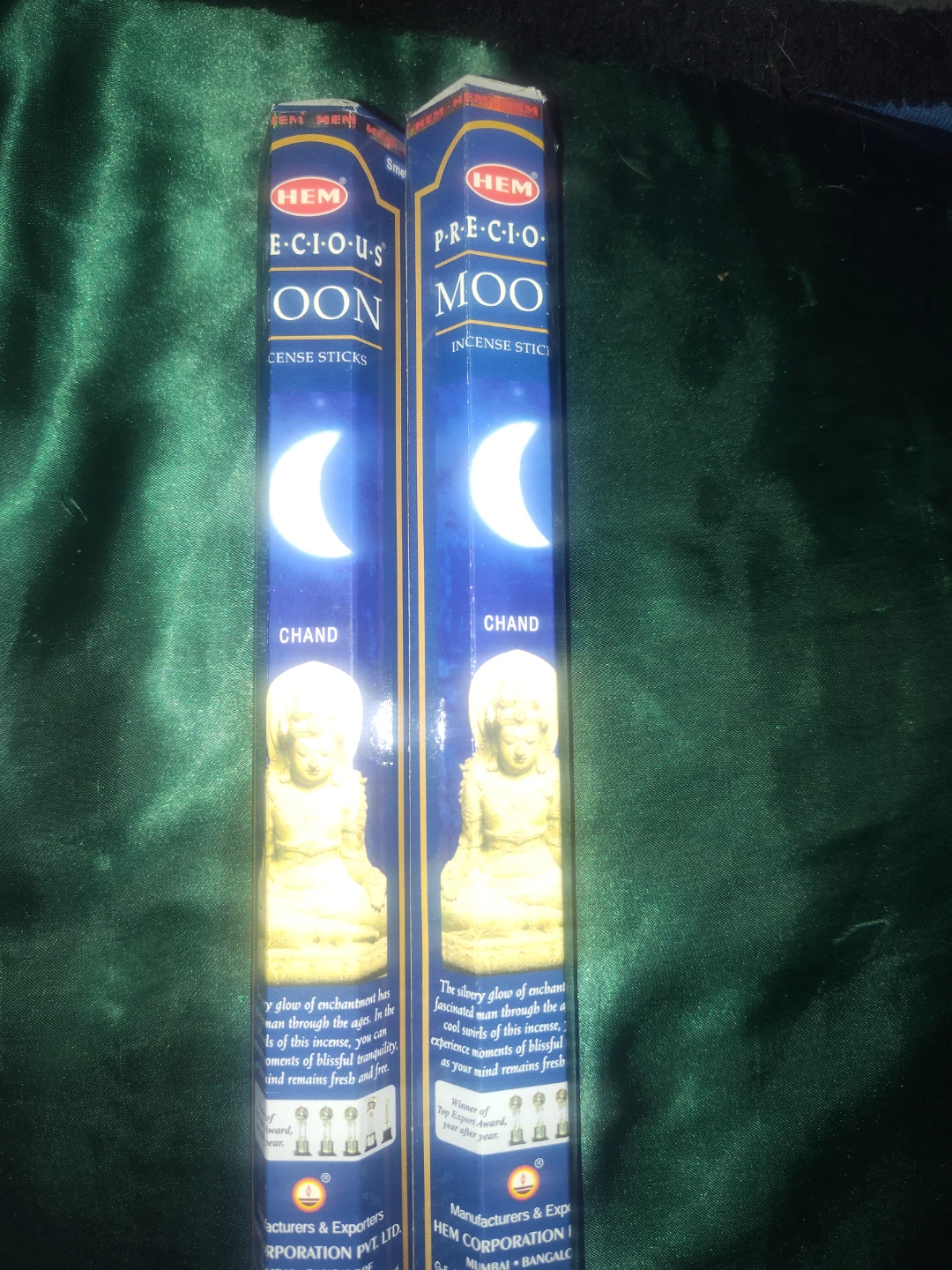 HEM "E-C-I-O-S MOON" Chand incense sticks. These sticks have a lovely scent. They're great for creating a relaxing atmosphere. Two packs included.