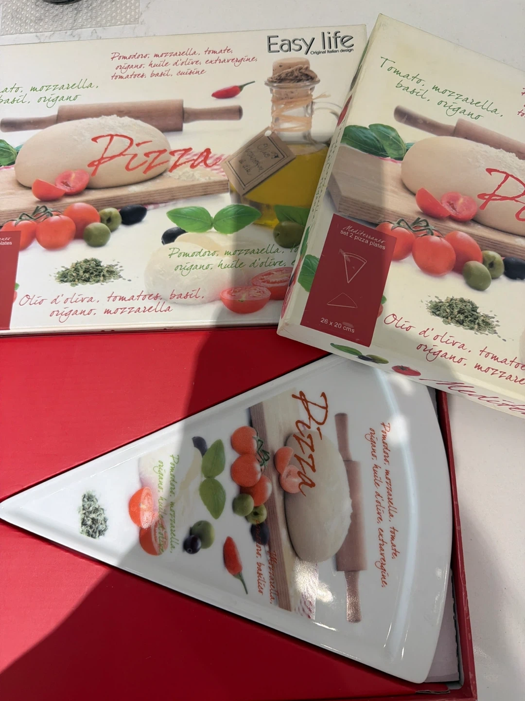 Selling a brand new set of Easy Life pizza plates, still in the original box! The set includes two plates, each measuring 26 x 20 cm. They feature a delightful Mediterranean design with tomatoes, mozzarella, basil, and olive oil motifs. Perfect for pizza night!