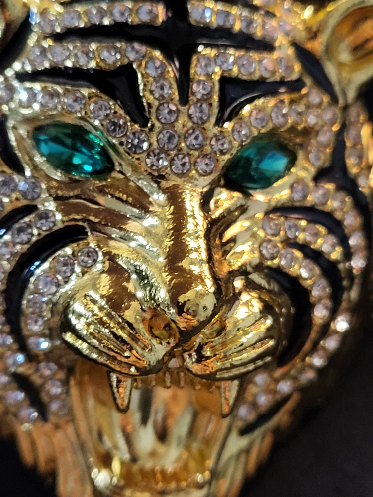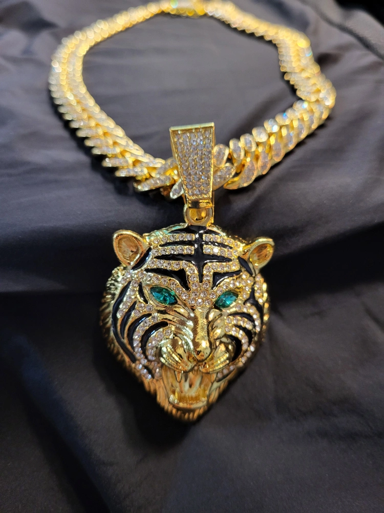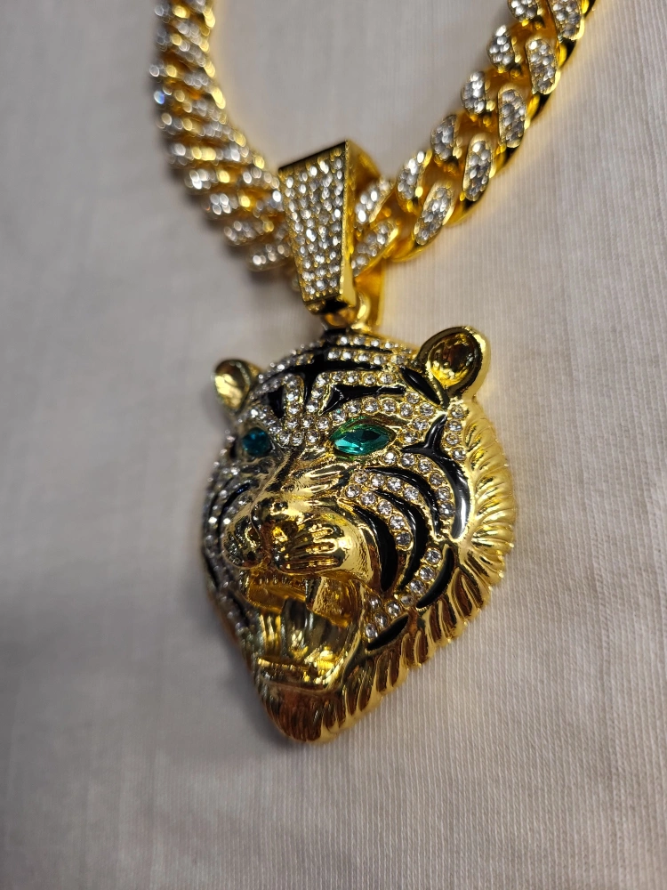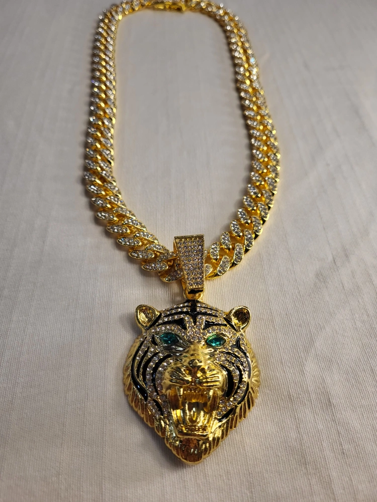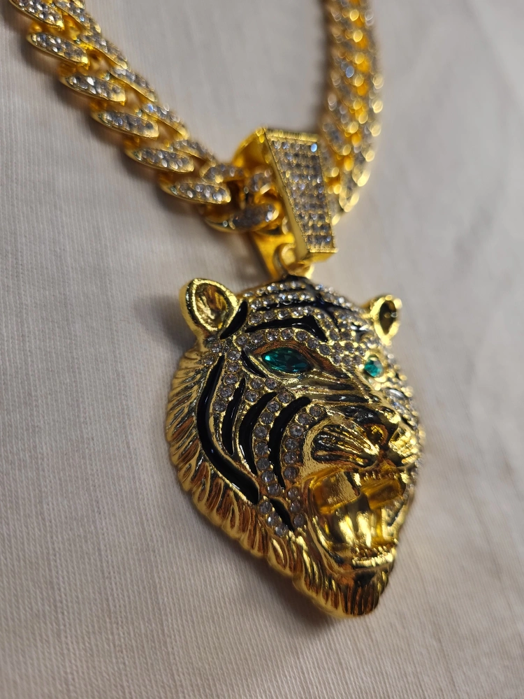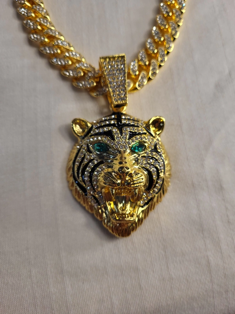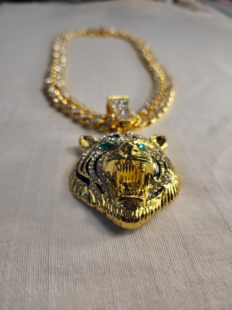 this necklace features a tiger pendant. It hangs on a gold chain. The tiger has emerald green eyes. Wearing this necklace will help you look and feel your best.