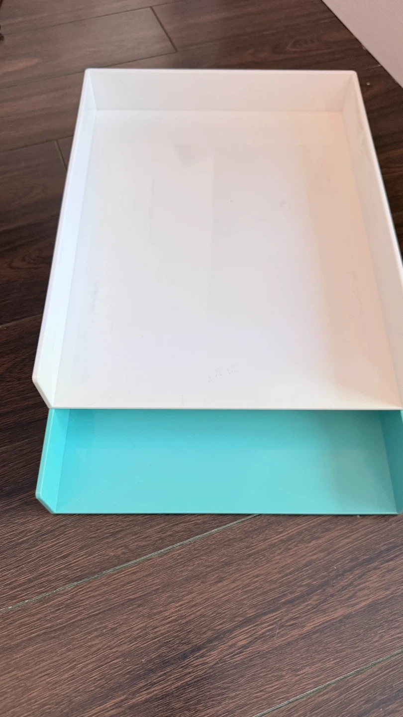 Set of two stackable desk trays. One white and one teal. Plastic material. Keep your workspace tidy! $5 each
