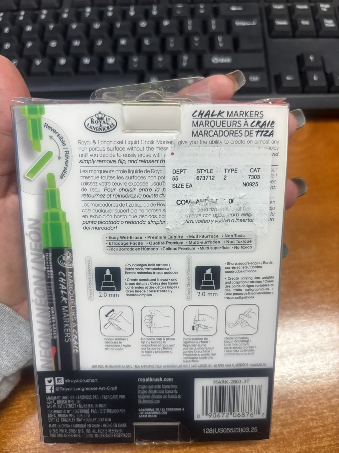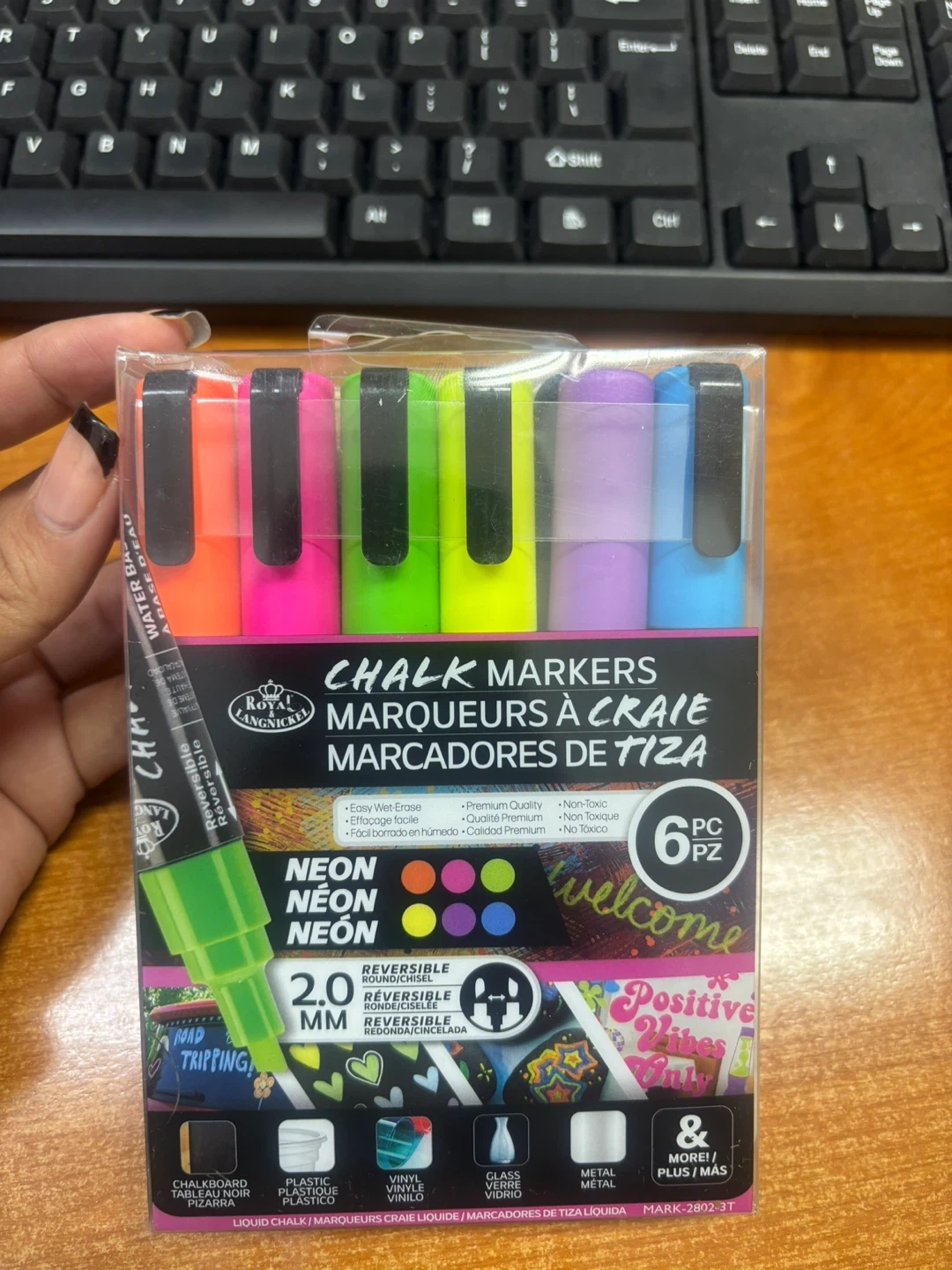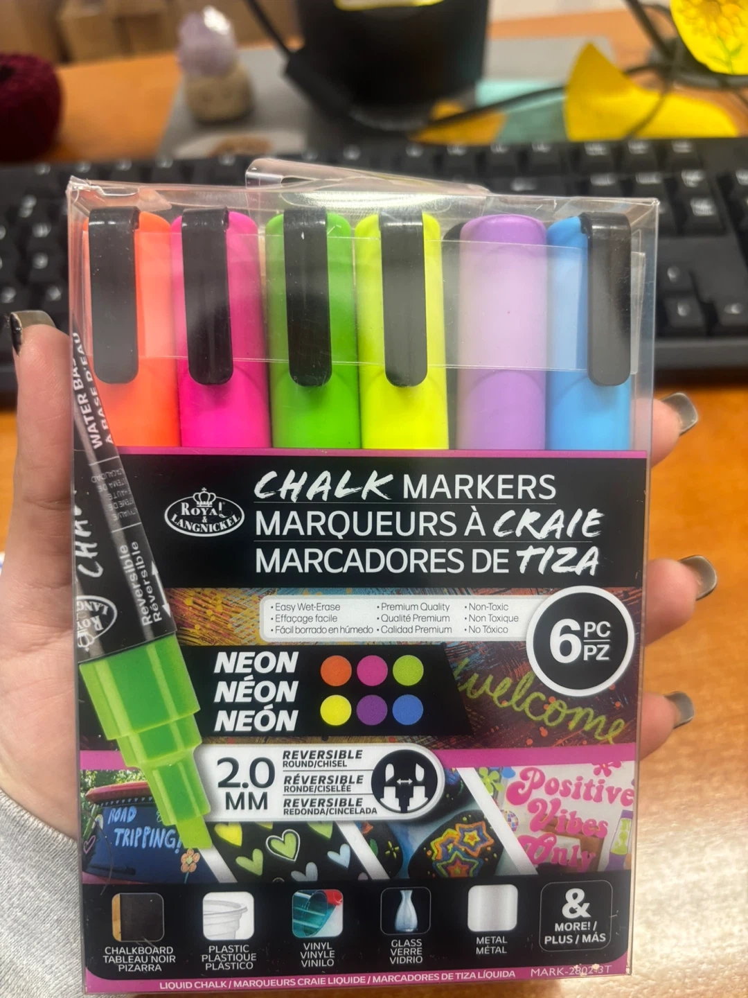 This set includes 6 Royal & Langnickel chalk markers in vibrant neon colors. They're water-based and feature a 2.0 mm reversible tip. These markers are great for drawing on chalkboards, glass, and non-porous surfaces!