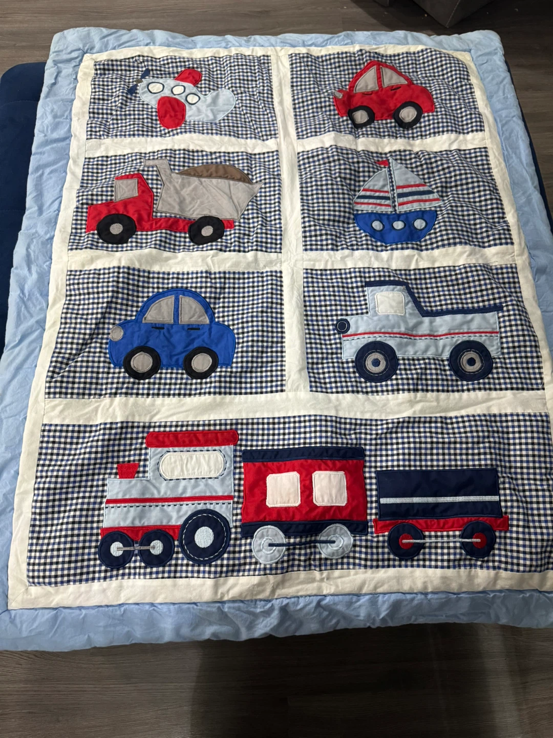 This cute crib bedding set features a fun patchwork design with various vehicles like trains, cars, trucks, and a boat. It's made with a blue and white gingham pattern. Perfect for a nursery!
