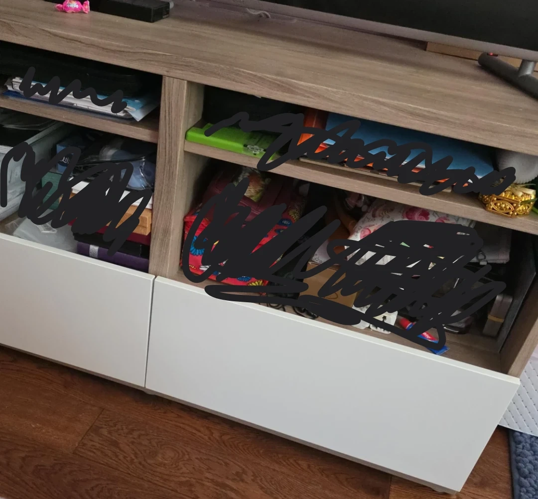 Selling a TV stand. It has a wood-look top and white doors. Working condition drawers. Small scratch that hides behind the TV once mounted.
