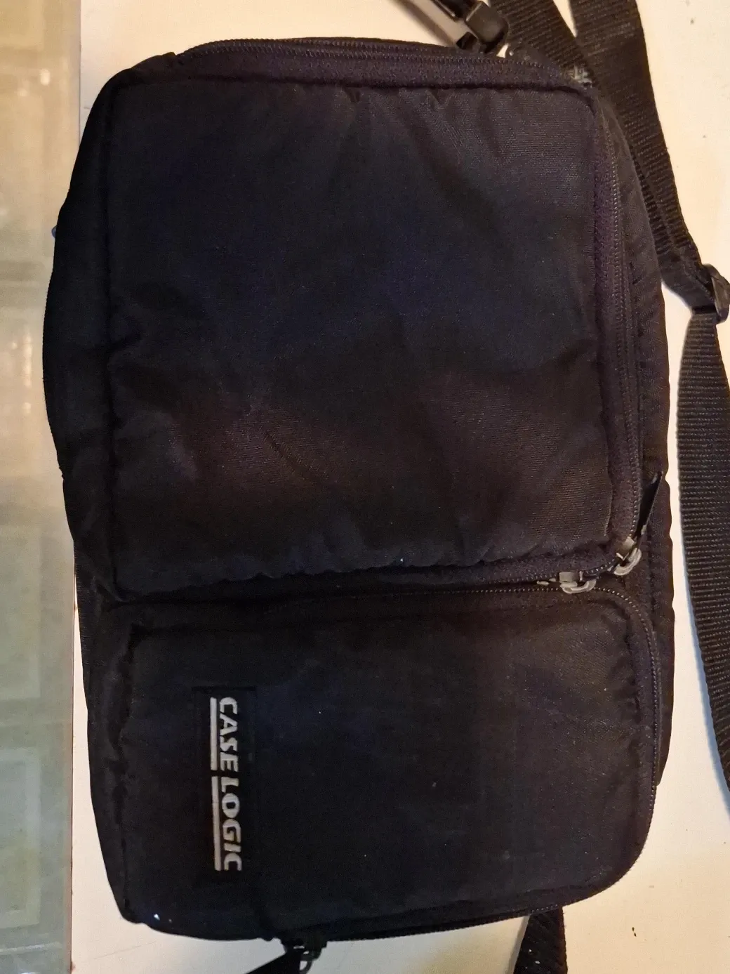 This is a black crossbody bag from Case Logic. It's made of durable material and features a zippered main compartment with an additional front pocket. It's perfect for carrying essentials on the go!
