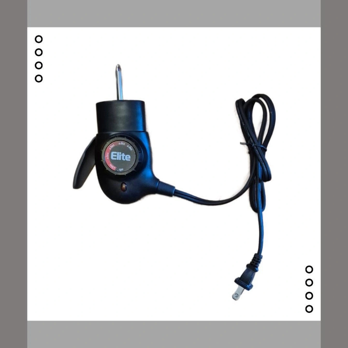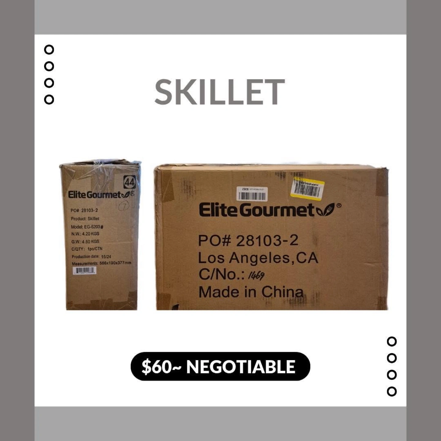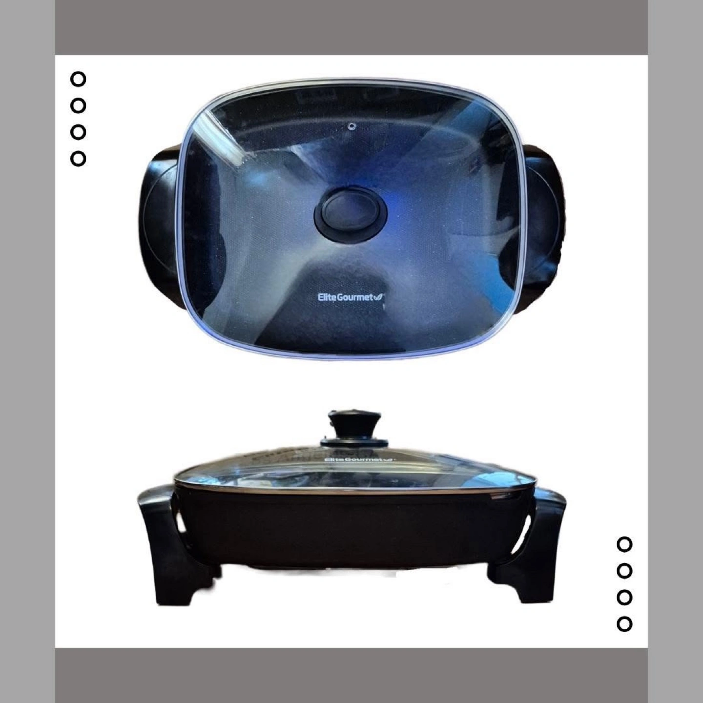 Selling an Elite Gourmet electric skillet. It comes with a glass lid and temperature control probe. The box is included, and it has a cooking time and temperature guide. It's a skillet with model number EG-6203
