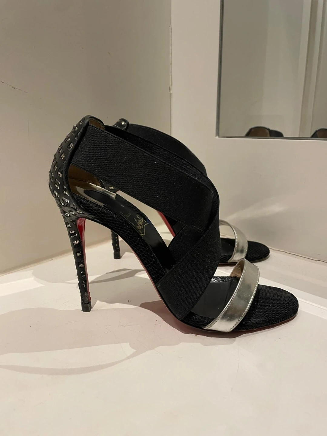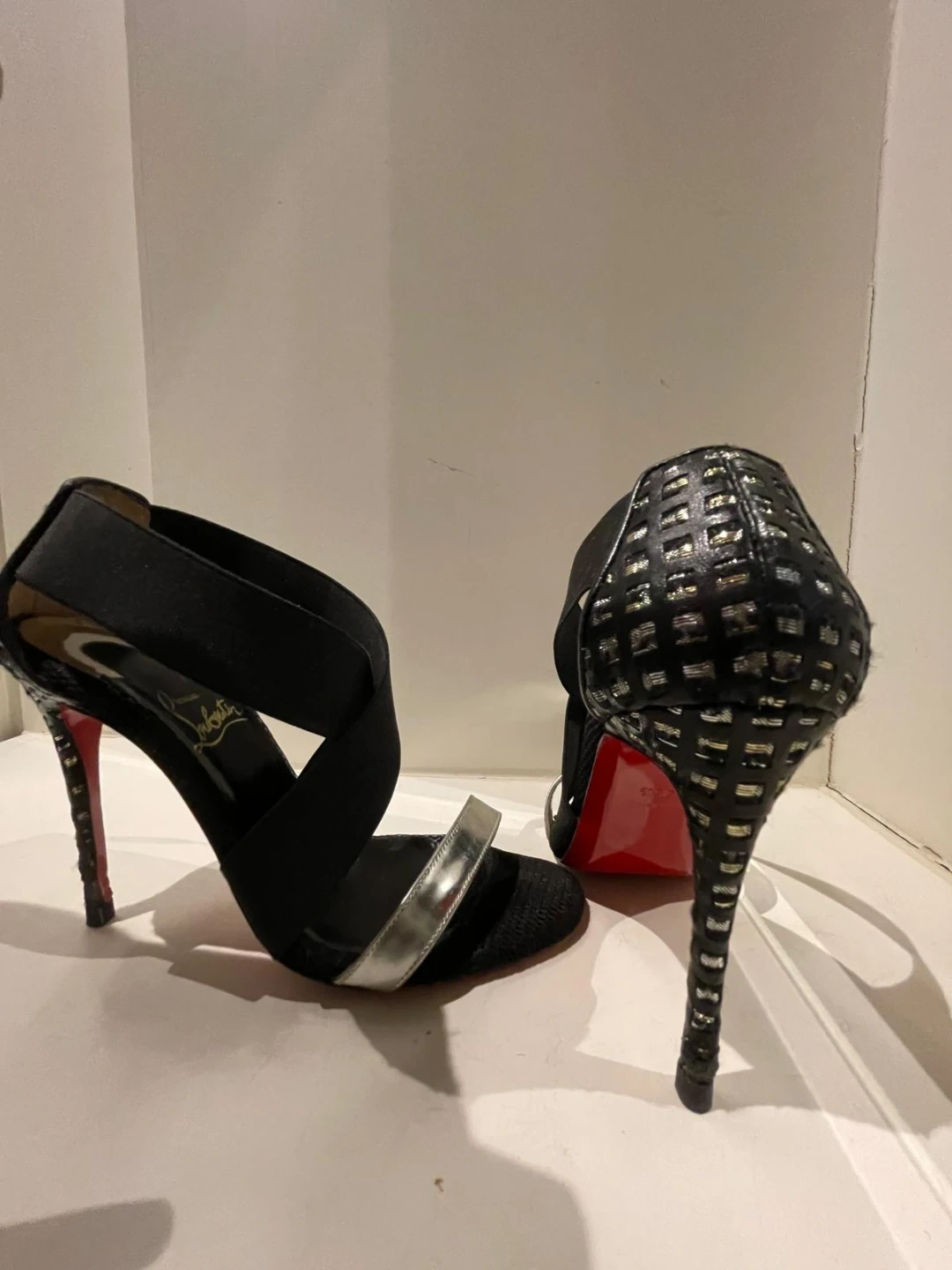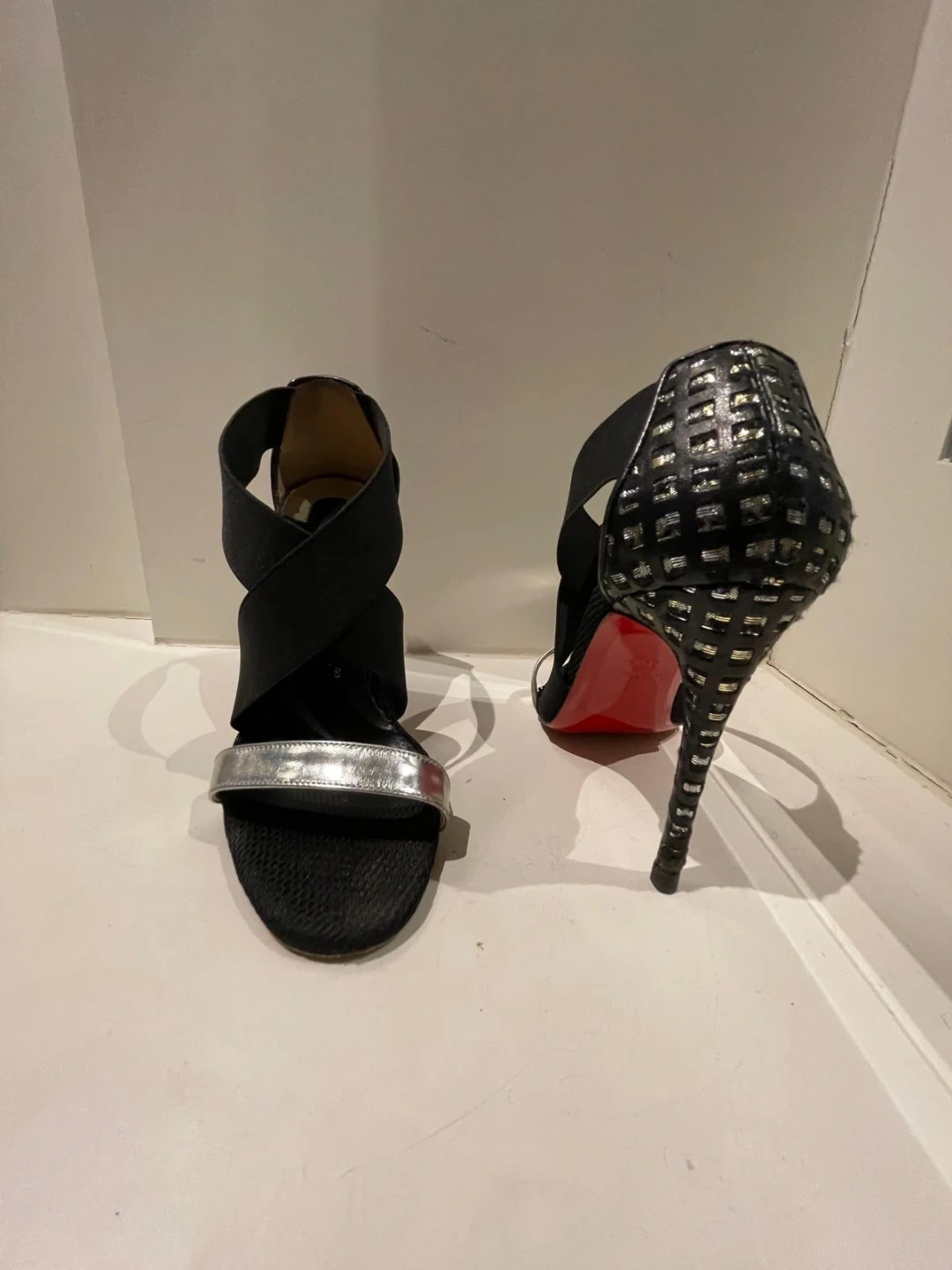 These are Christian Louboutin heels in black with silver accents. They feature a unique design with elastic straps. The iconic red soles are in great shape!