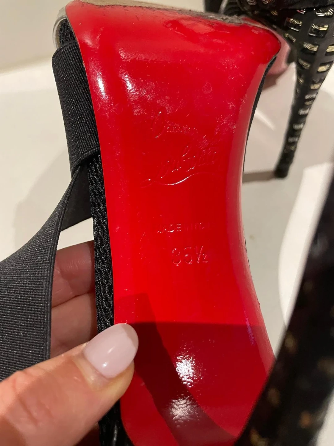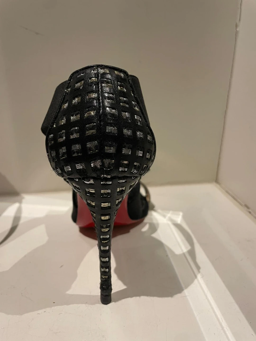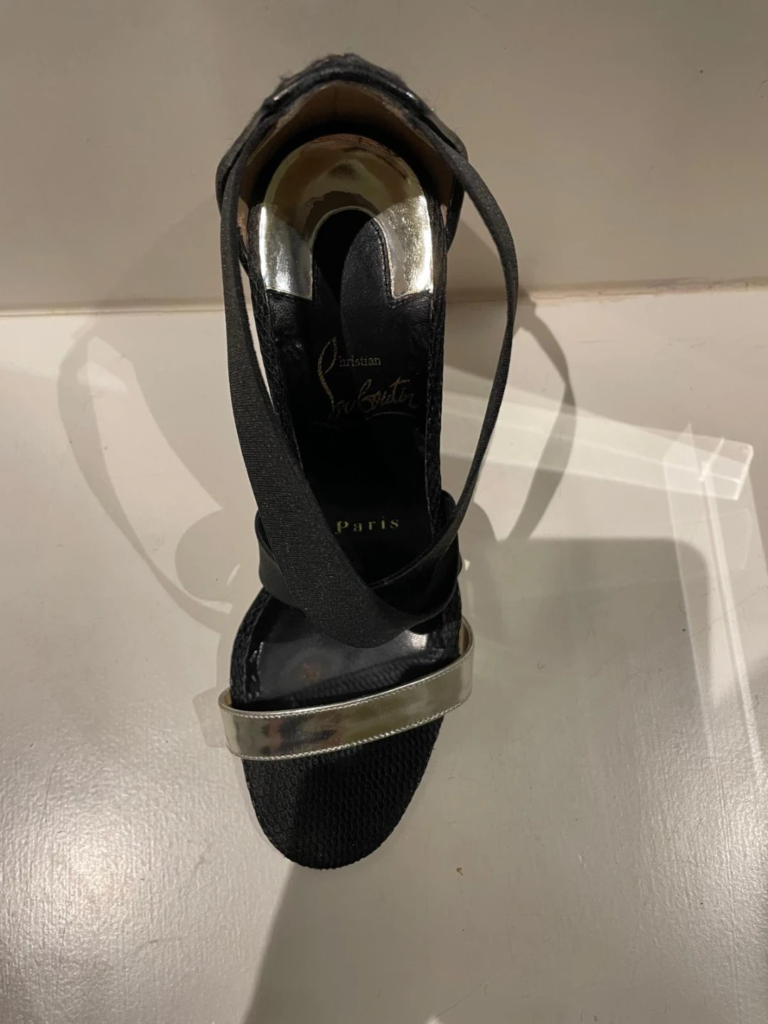 These are Christian Louboutin heels in black with silver accents. They feature a unique design with elastic straps. The iconic red soles are in great shape!