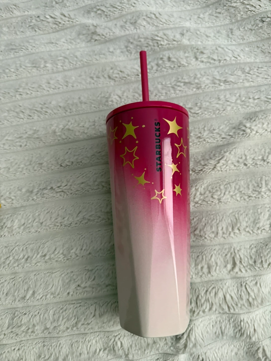 This Starbucks tumbler features a gradient pink and white design with gold stars. It includes a matching pink straw. It's great for on-the-go drinks!