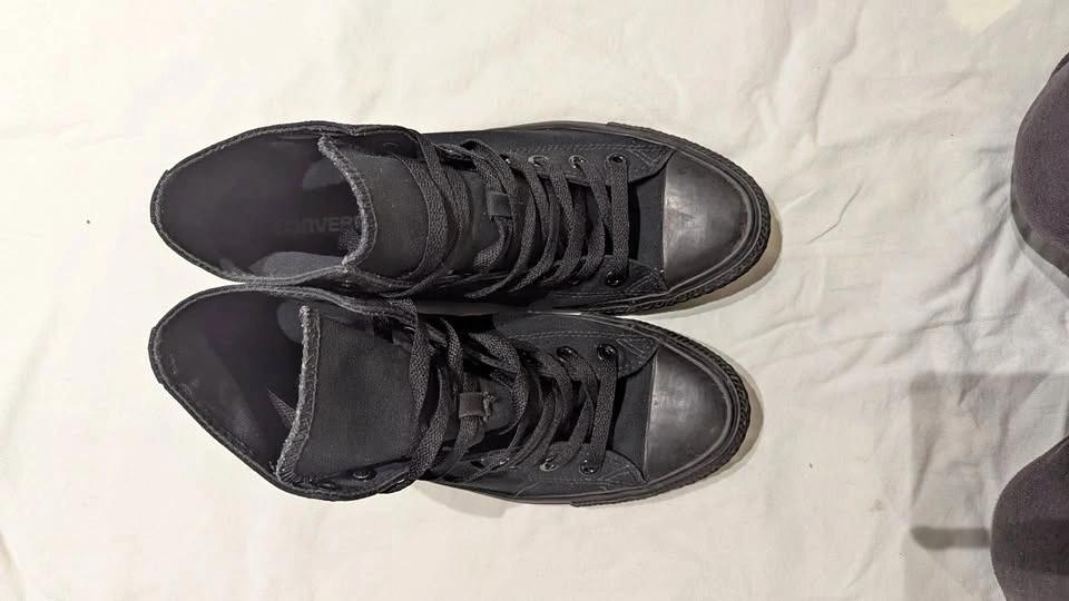 Men's size 8.5, black Converse Chuck Taylor All-Stars. Features a canvas upper and lining, classic white rubber toe cap, lace-up front, and a cushioned insole. The vulcanized rubber outsole provides traction and flexibility. Original Chuck Taylor logo patch. Pick up in Kitchener or Brampton.