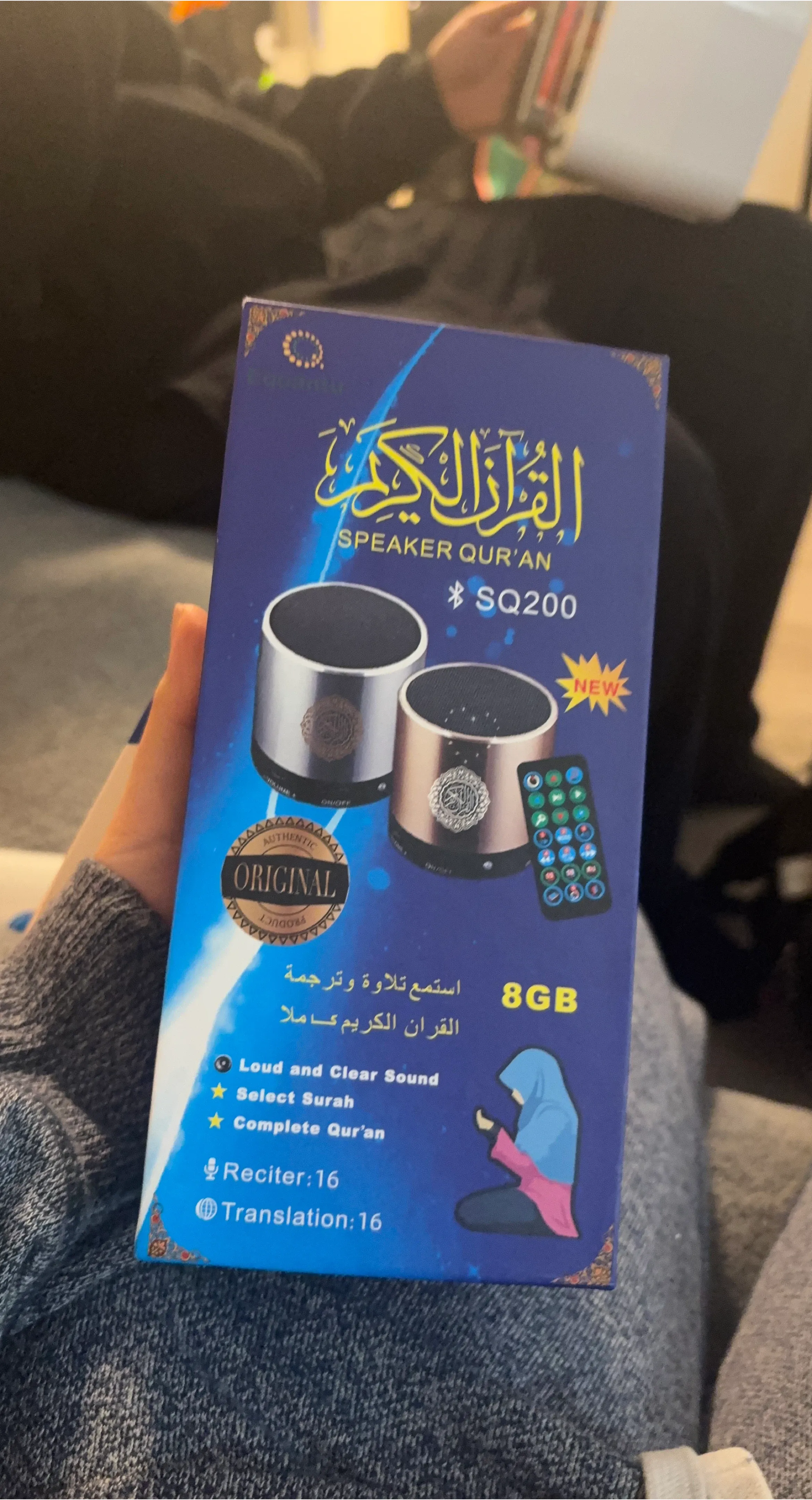 This is a Speaker Qur'an SQ200 with 8GB of storage. It offers loud and clear sound, allowing you to select Surahs and complete the Qur'an. It includes 16 reciters and 16 translations. This speaker is useful for learning and listening to the Qur'an.