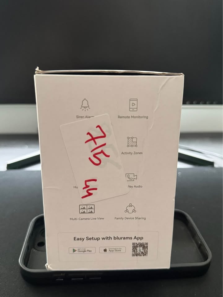 Smart blurams Omni Outdoor Camera still in box. Has 2K resolution with pan-tilt-zoom. IP66 weatherproof, color night vision, motion tracking, and instant notifications. Works with Alexa and Google Assistant. Model S20C. Supports local micro SD card and cloud storage. Easy setup with blurams app. Great for home security!