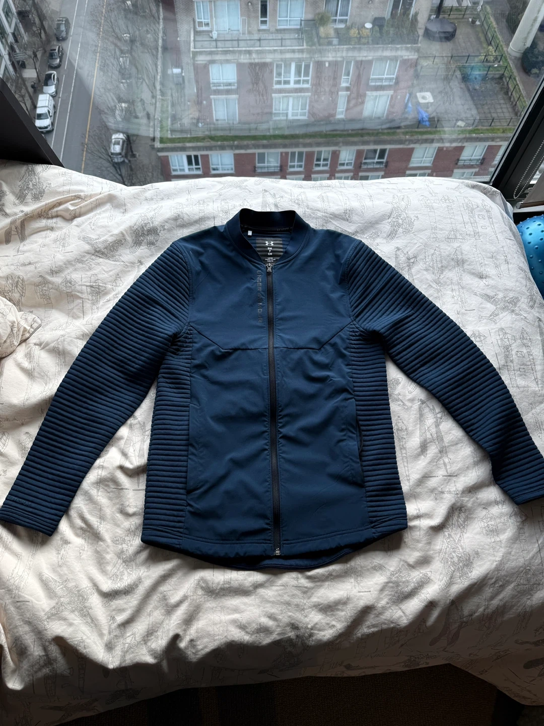 This is an Under Armour jacket in navy blue. It's a size small with a loose fit. The jacket has ribbed sleeves and a full zip closure.