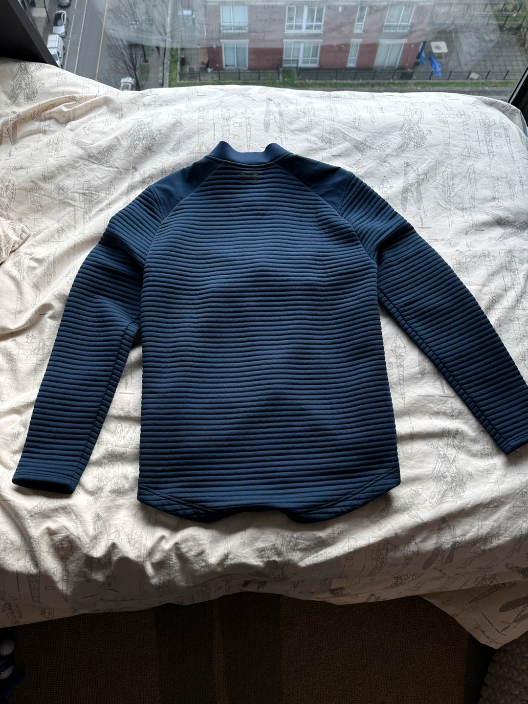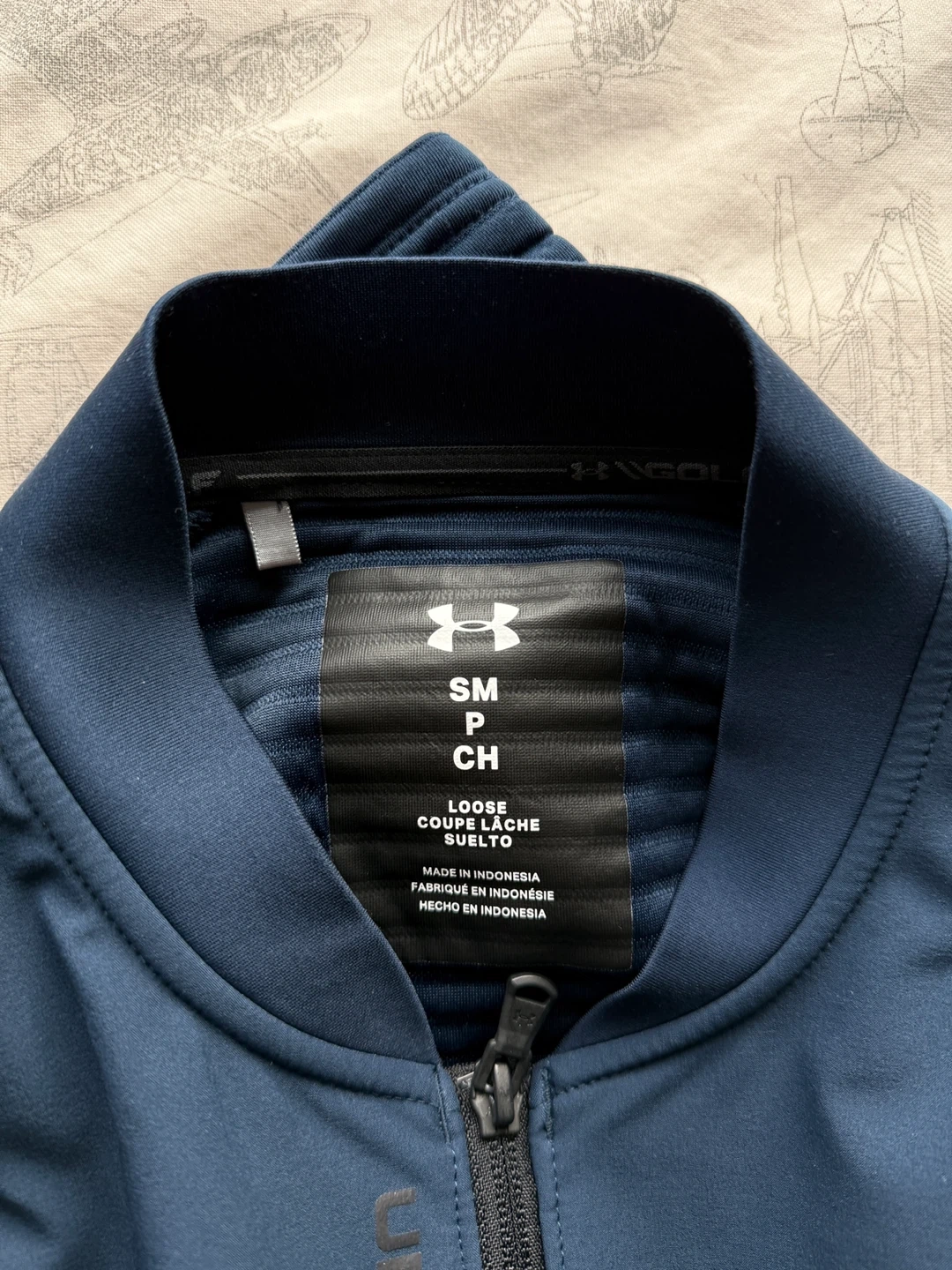 This is an Under Armour jacket in navy blue. It's a size small with a loose fit. The jacket has ribbed sleeves and a full zip closure.
