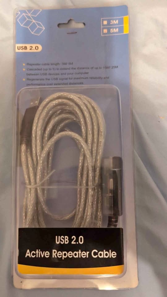 New USB 2.0 Active Repeater Cable. Cable length 3M/5M. Can be cascaded up to 5 to extend distance up to 15M/25M between USB devices and computer. Regenerates USB signal for maximum reliability and performance over extended distances.