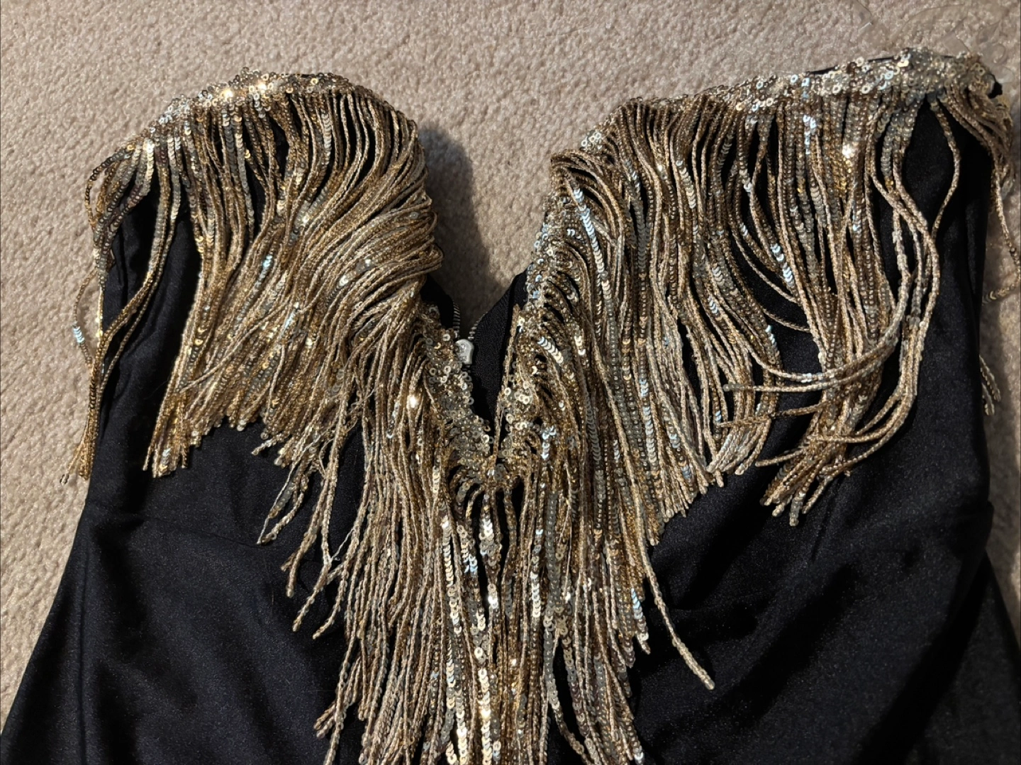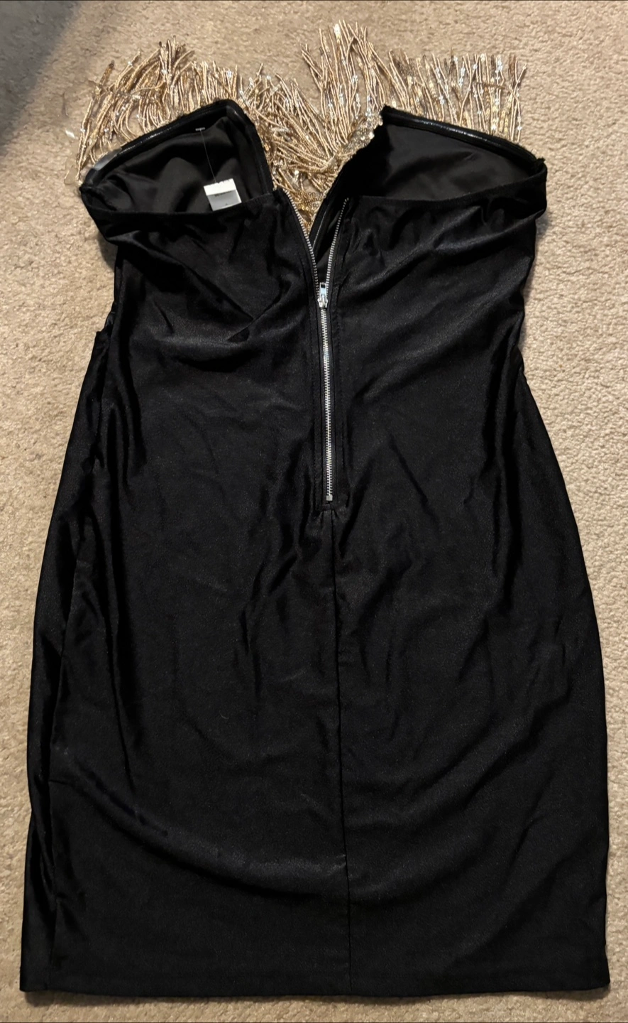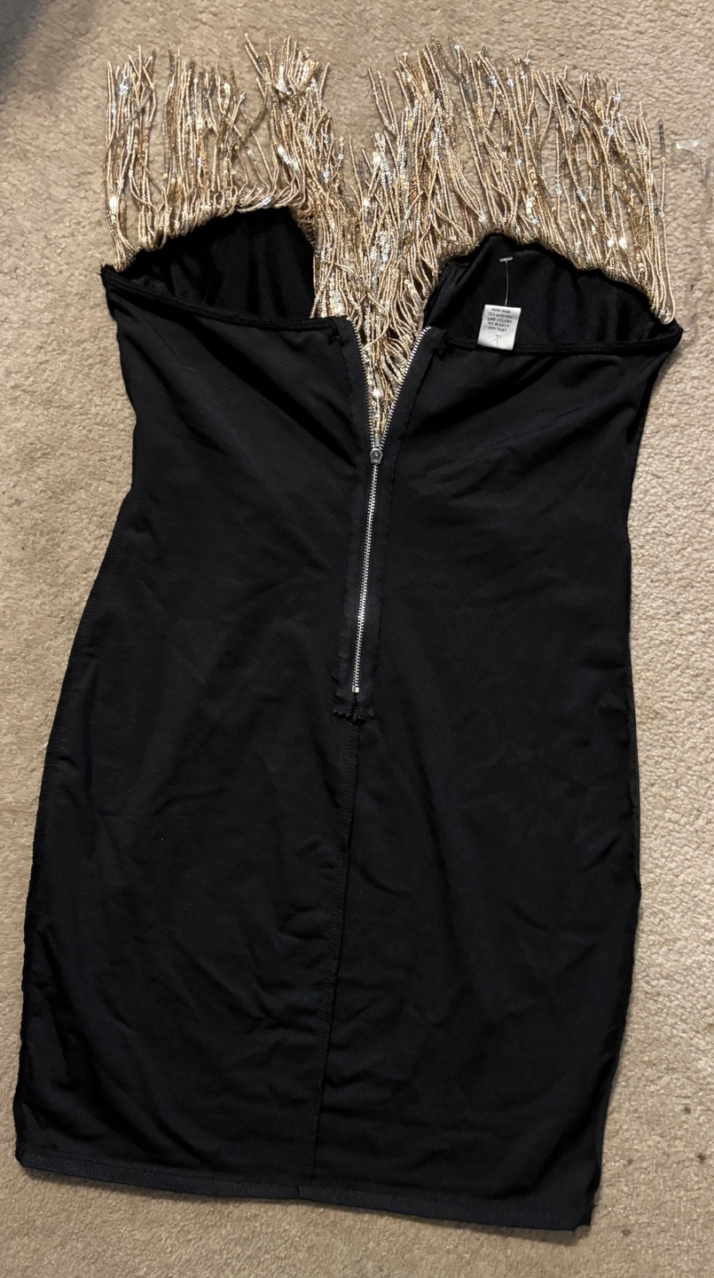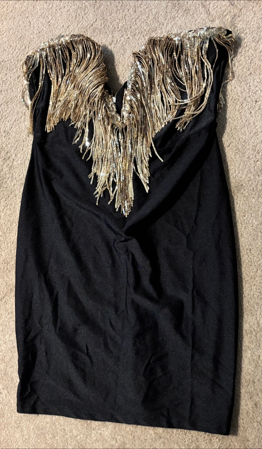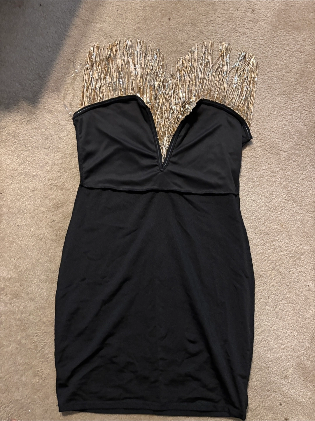Selling a cute black dress with gold fringe detailing!. Size .. large. It's a fun piece for a night out or a special occasion. The dress is like NEW with tag … and ready to give an attractive look to any person.