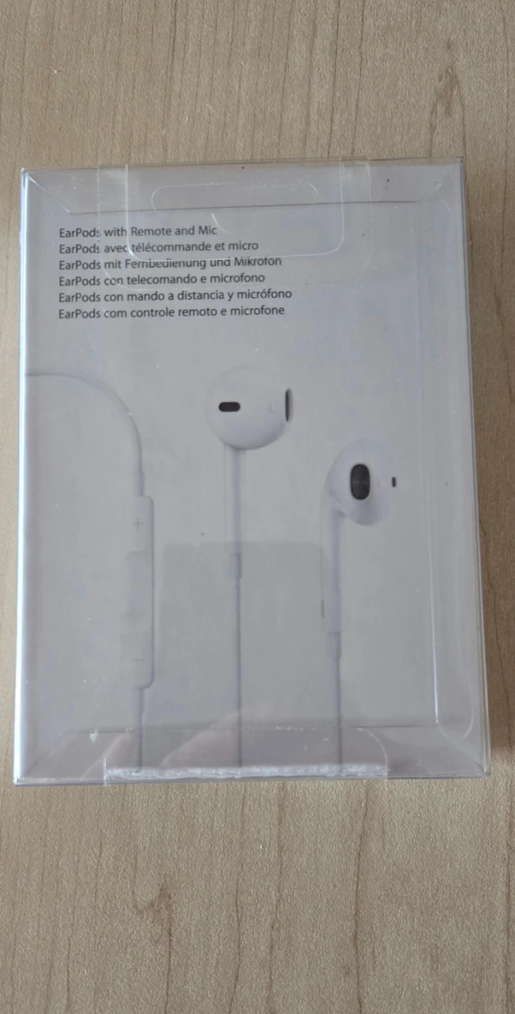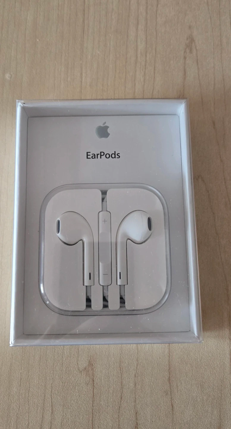 These are the Apple EarPods with built-in remote and microphone. They offer a comfortable fit and clear audio. The remote allows for volume adjustment, music and video playback control, and answering or ending calls. Includes original packaging.
