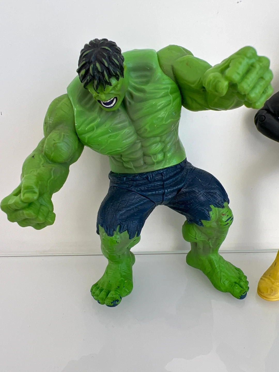 Includes a Hulk action figure with dark blue shorts and a Cyclops action figure from the X-Men. These figures are made of plastic.