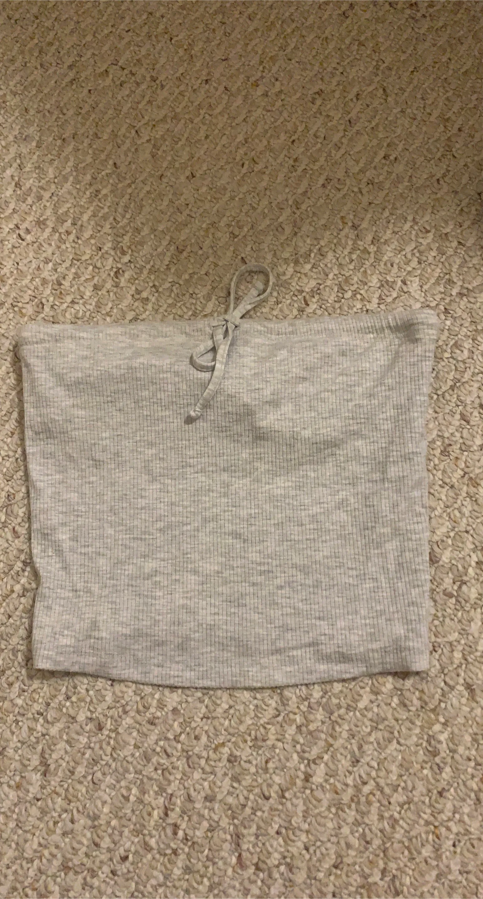 Grey ribbed tube top with a tie detail at the front. It's made of a stretchy smooth material and is double lined XS. This top is sleeveless and strapless. Perfect for layering/summer