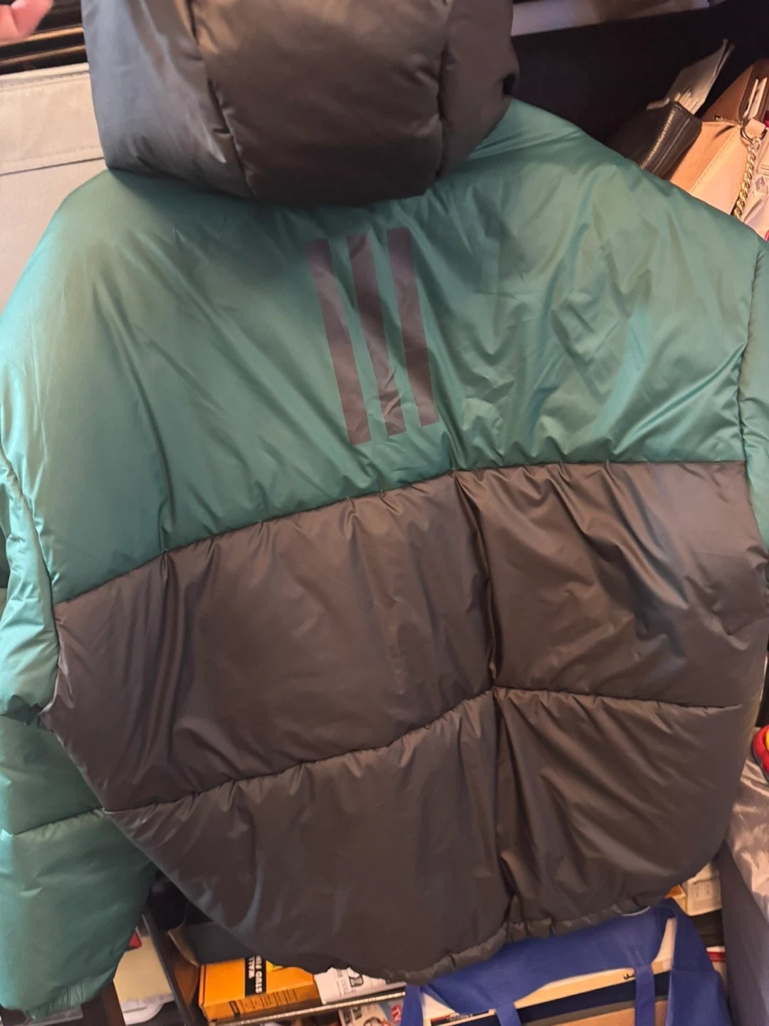 This is an Adidas puffer jacket in a green and grey colourway. It's a size 2XL.