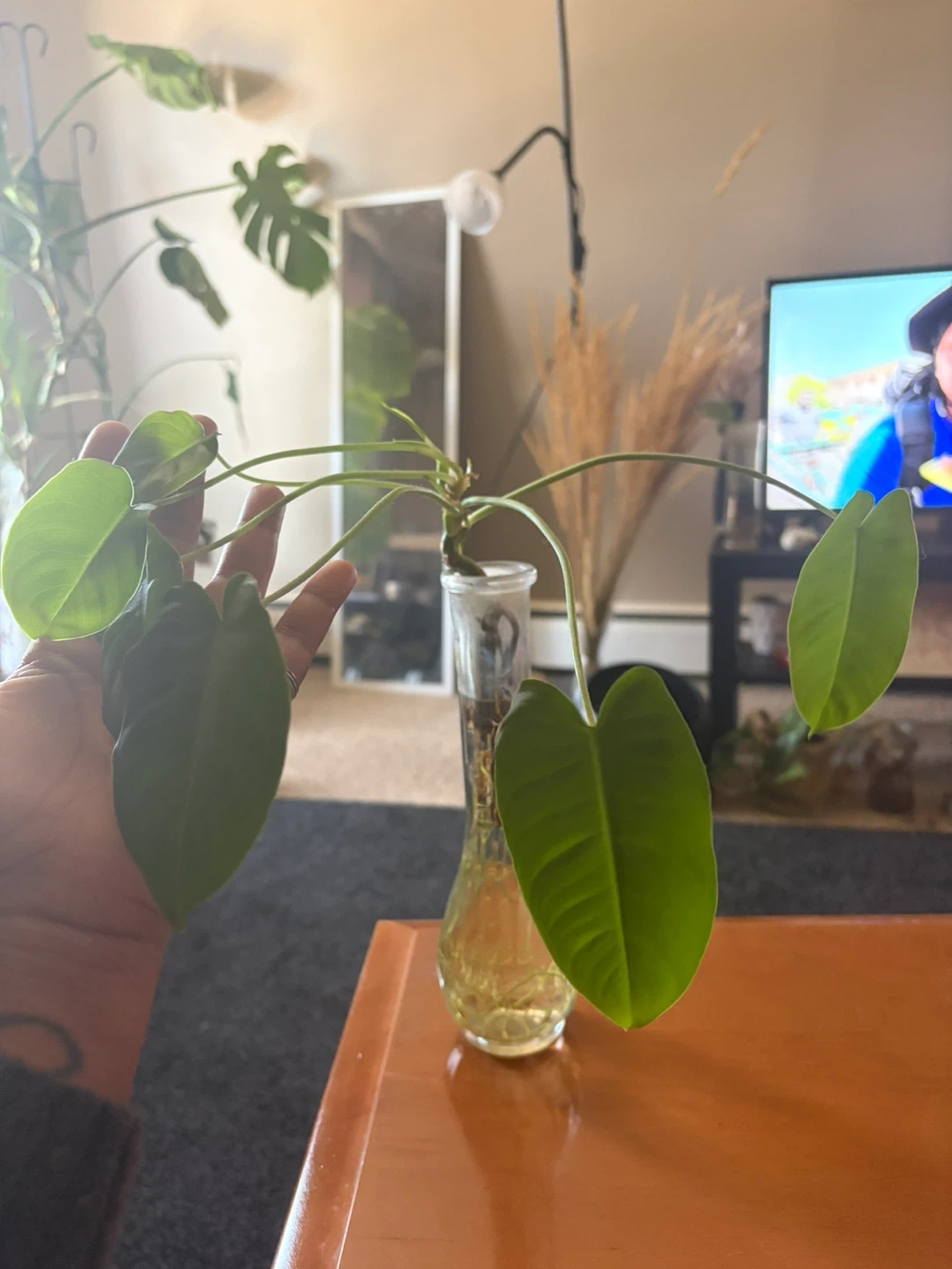 This is a live Philodendron plant cutting rooted in water. It's ready to be planted in soil. It has several healthy leaves and is growing new ones. This plant is great for starting your indoor jungle or adding greenery to your space!