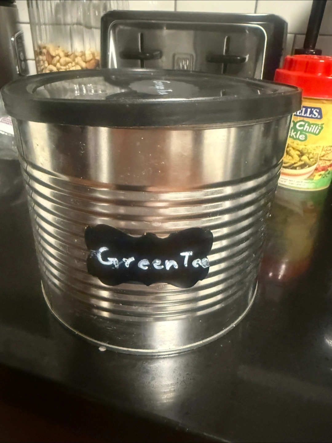 Selling a metal storage container, perfect for keeping your green tea fresh! It has a chalkboard label on the front so you can easily identify what's inside