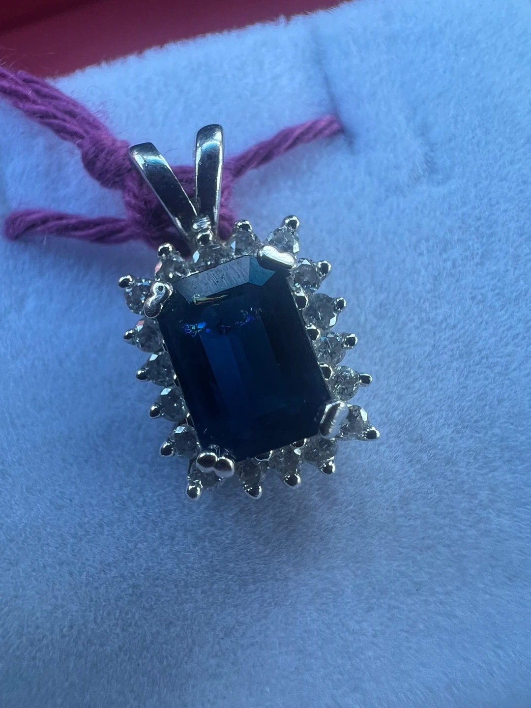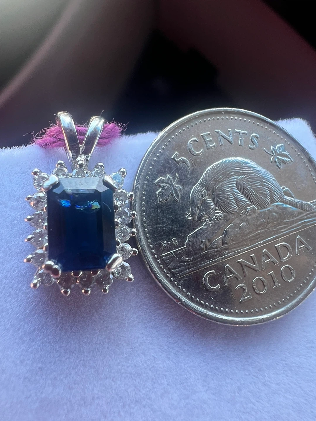 Beautiful 14 k emerald cut sapphire pendant surrounded by small diamonds. Great for adding a touch of elegance to any outfit!