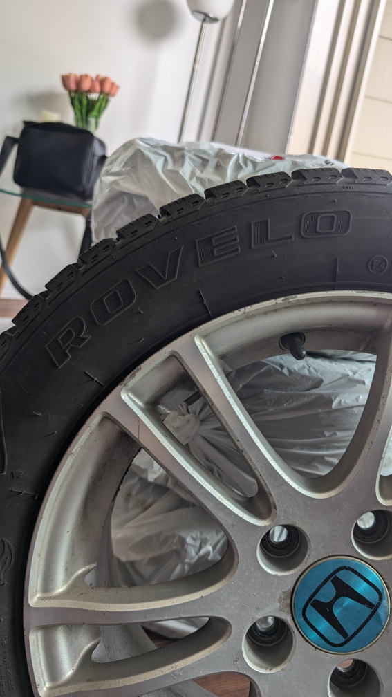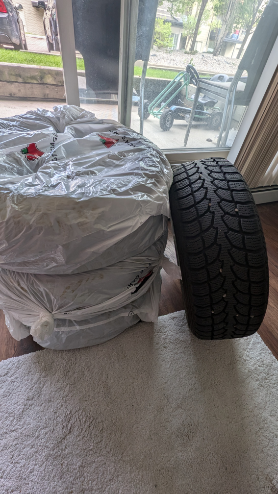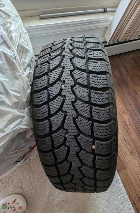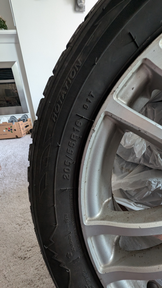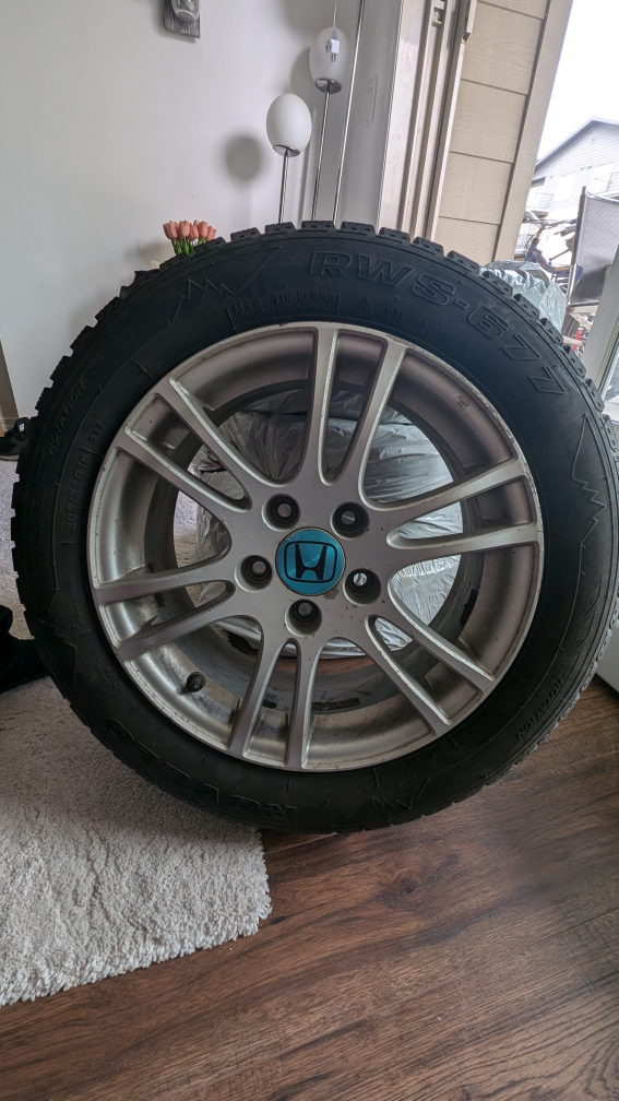 Selling a set of winter tires, size 205/55R16. They're mounted on Honda alloy rims. The tread depth is pretty good, as you can see from the picture with the coin
