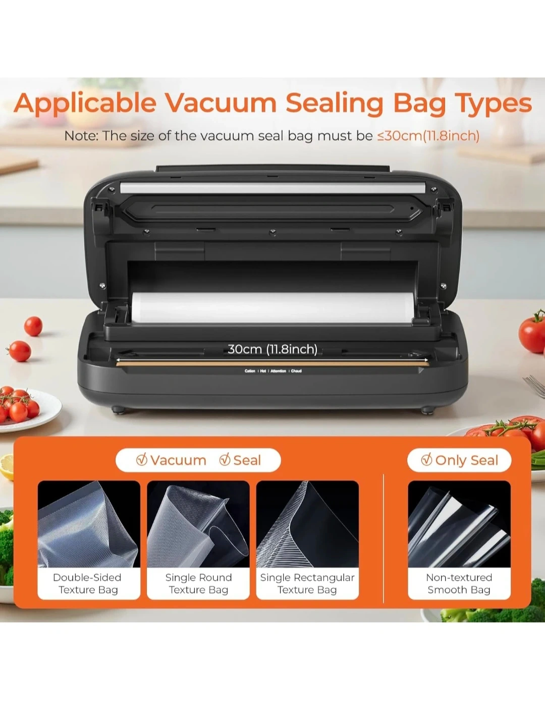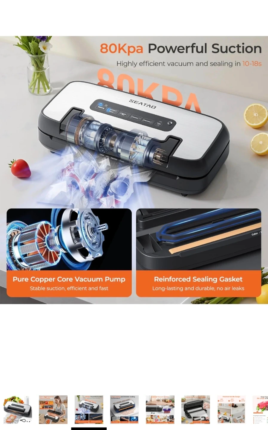 SEATAO 7-in-1 vacuum sealer machine for all your sealing needs! It boasts 80KPa powerful suction and a pure copper core vacuum pump for efficient operation. Features a reinforced sealing gasket, extended 12-inch heating strip, and overheat protection for reliable sealing. Useful for preserving food, marinating, and general storage. Includes a roll of vacuum bags and an external vacuum hose for canisters and wine bottles.