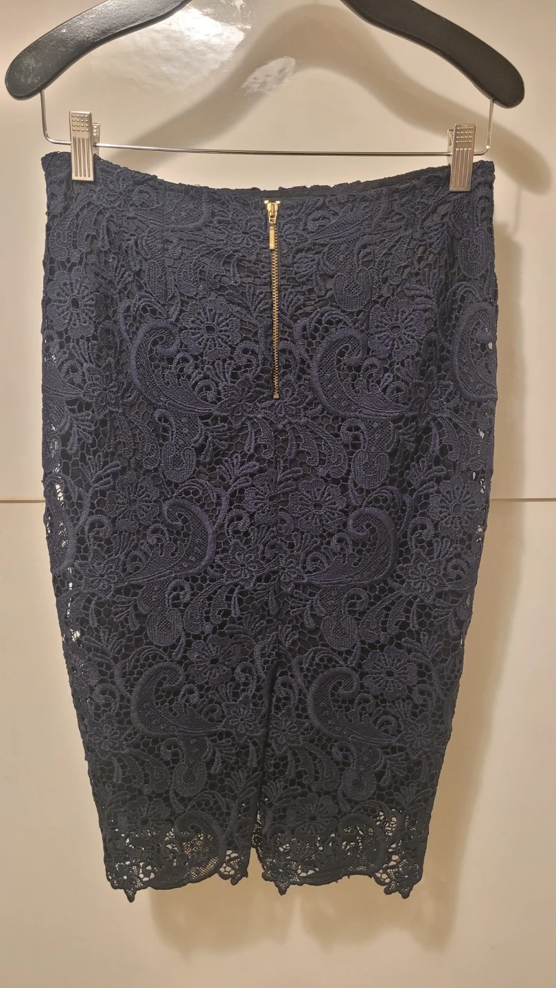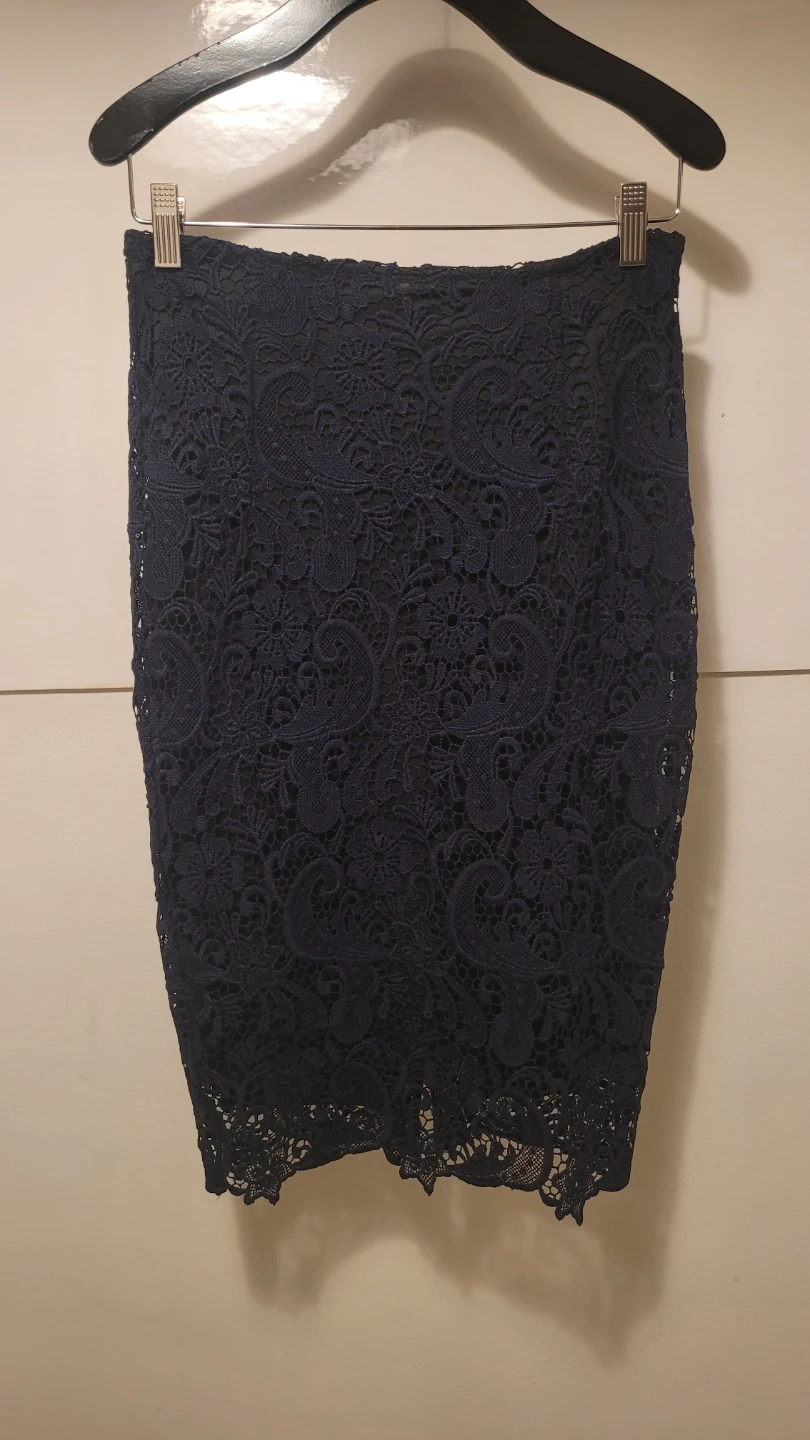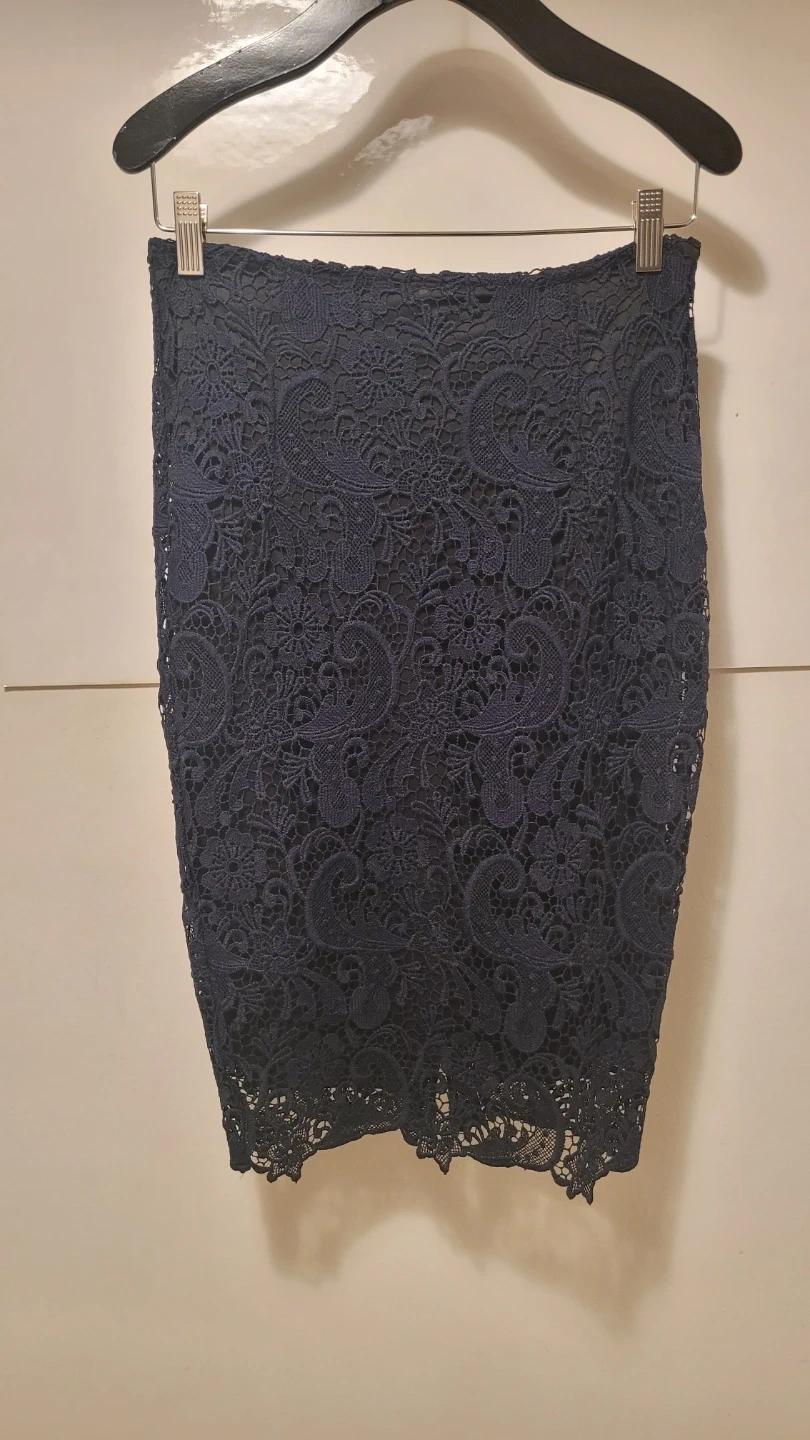 This Zara Basic navy lace pencil skirt is a size small. It's made in Spain and features a zipper closure. The intricate lace detailing makes it a lovely option for dressy occasions.