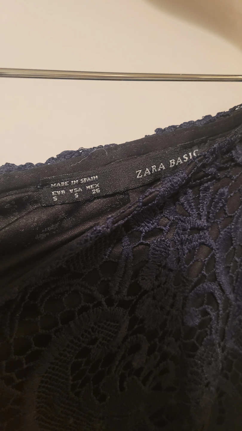 This Zara Basic navy lace pencil skirt is a size small. It's made in Spain and features a zipper closure. The intricate lace detailing makes it a lovely option for dressy occasions.
