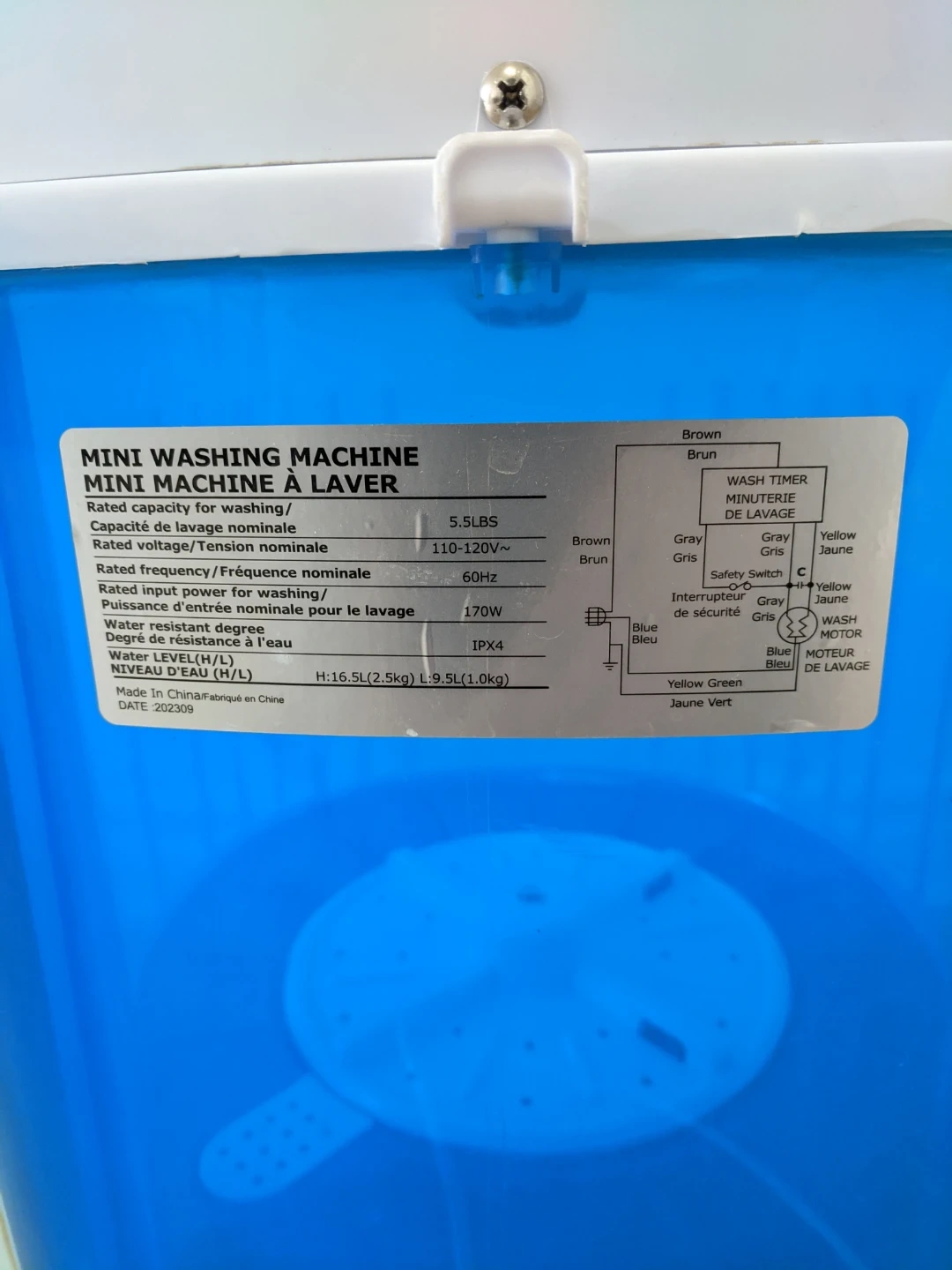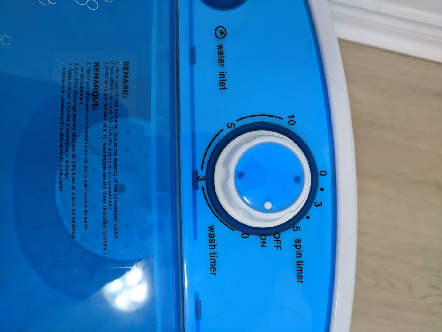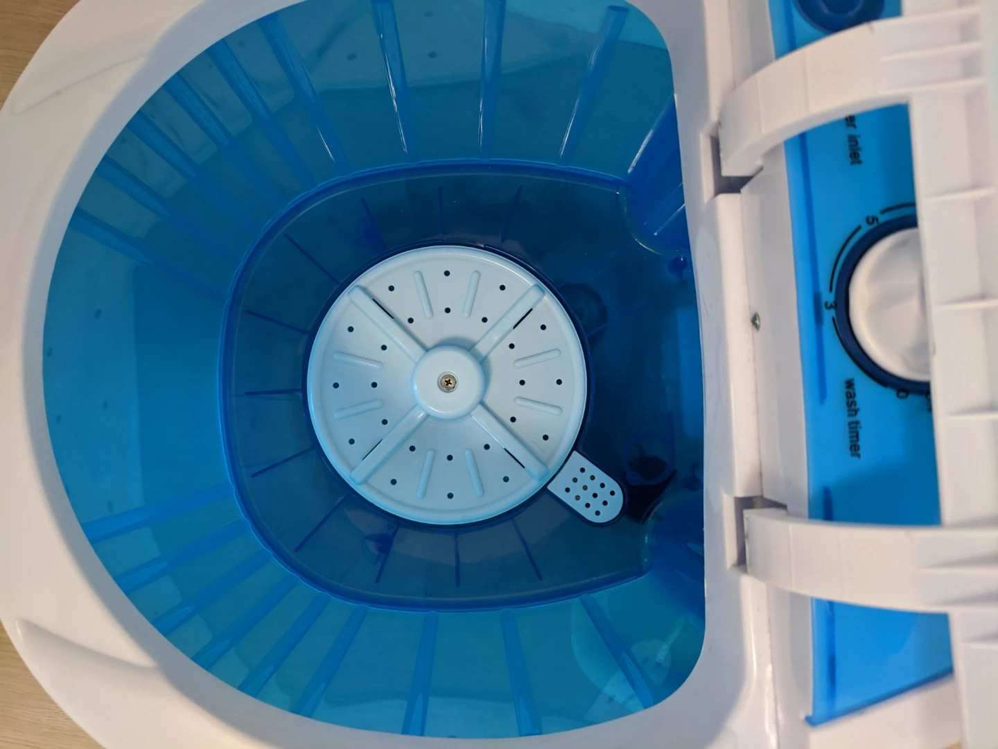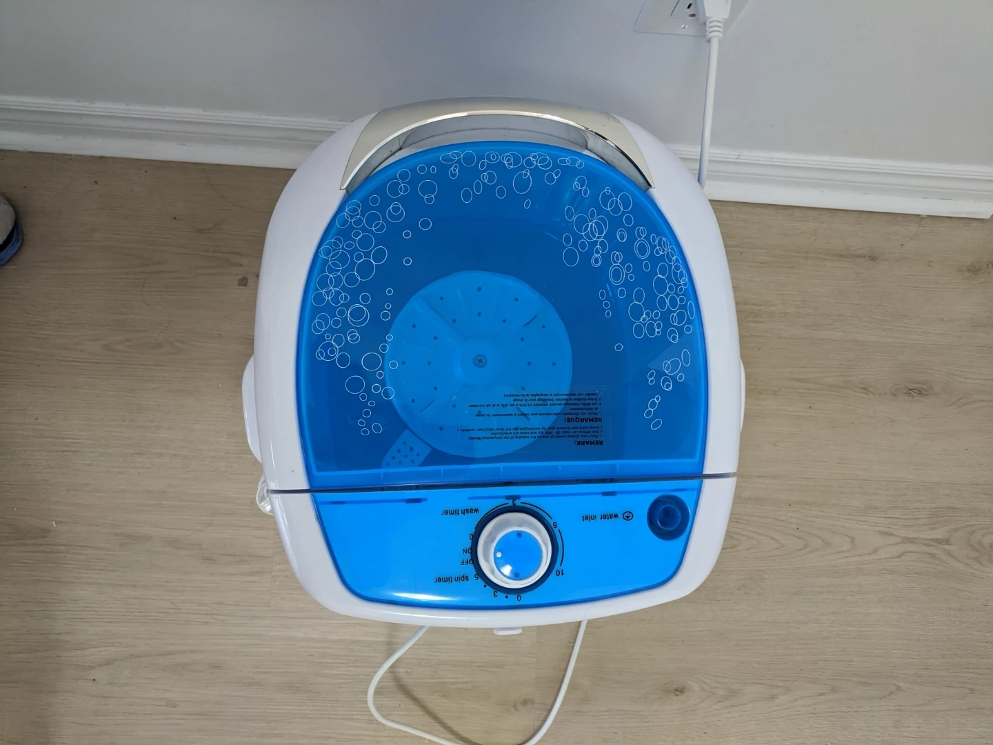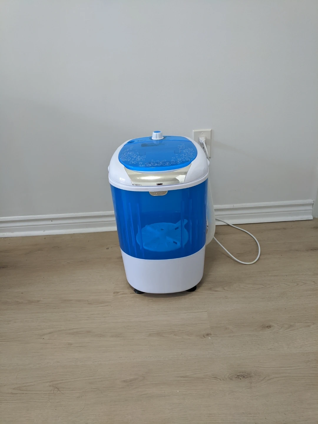 This is a compact portable washing machine in blue and white. It features a wash timer and spin timer. It's perfect for small loads of laundry, like delicates or single items. Pick up at 195 Merton Street Toronto or pick up at Subway station Davisivill. And I can deliver it to your house but you need to pay me another $5. Thanks.