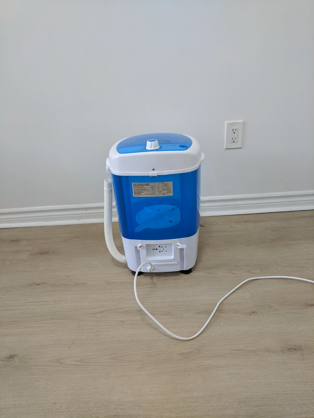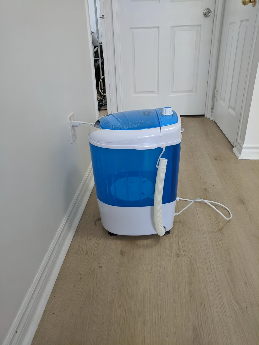 This is a compact portable washing machine in blue and white. It features a wash timer and spin timer. It's perfect for small loads of laundry, like delicates or single items. Pick up at 195 Merton Street Toronto or pick up at Subway station Davisivill. And I can deliver it to your house but you need to pay me another $5. Thanks.