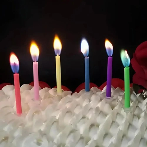 Add a splash of excitement to any celebration with these vibrant candles that burn with colored flames, creating a mini light show! Perfect for any cake, measuring 55mm in length and 5mm in diameter. Features 6 stunning flame colors (Red, Pink, Yellow, Blue, Green, Purple), ideal for birthdays, anniversaries, and other joyous events. Made from non-toxic, water-soluble materials. Each candle burns for up to 5 minutes and comes with its own plastic holder, ensuring no wax drips. For the best color flame effect, light these in a dim or dark room.