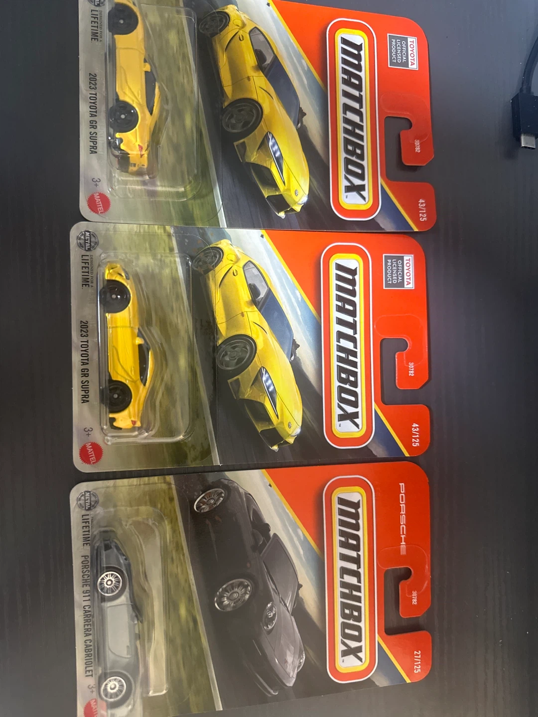 Selling two Matchbox cars: a 2023 Toyota GR Supra (yellow) and a Porsche 911 Carrera Cabriolet (grey). Both are still in their original packaging and would be a great addition to any collection