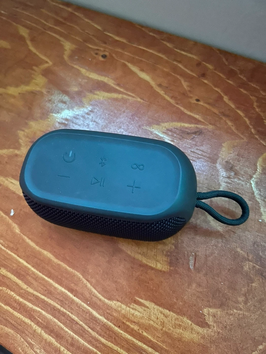 This is an onn. Bluetooth small rugged speaker. It's dark grey and comes with a fabric loop for portability. Up to 10 hours playtime.
